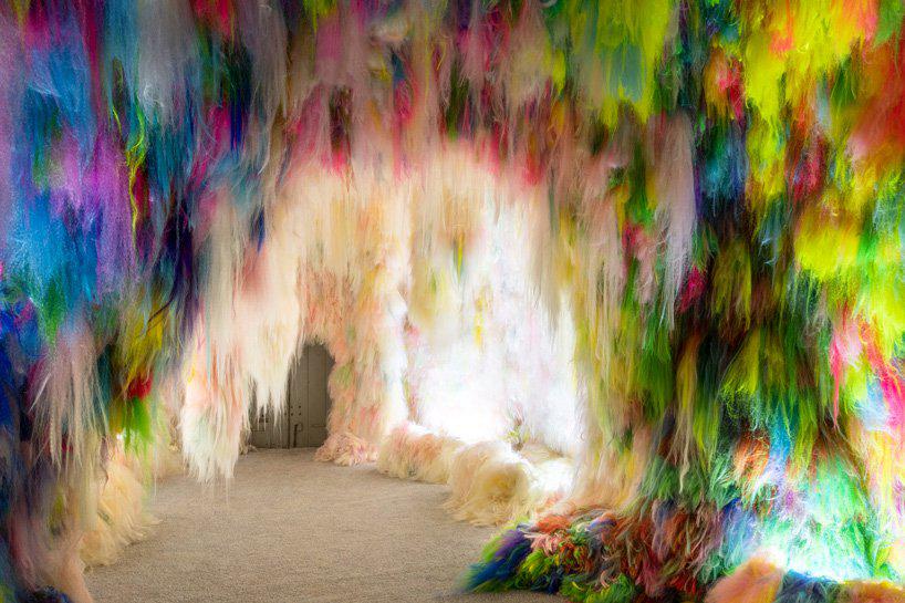 designboom_for the pavilion of iceland at the venice art biennale 2019, artist hrafnhildur arnardóttir / shoplifter has transformed a warehouse in the island of giudecca into a multi-sensory, cavernous environment, made of her signature material: synthetic hair. titled chromo sapiens, the exhibition combines color, sound, and textures that immerse visitors in an audiovisual experience.