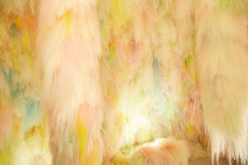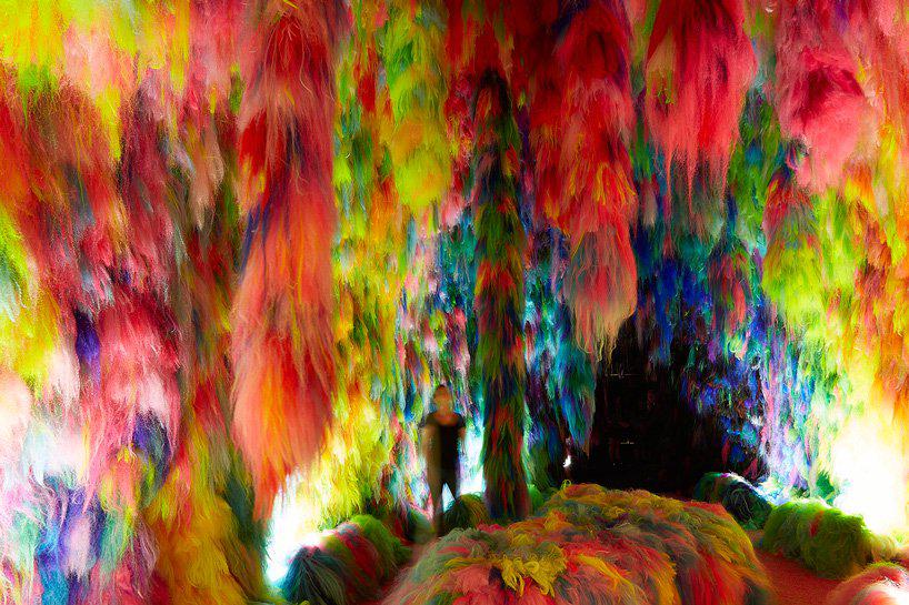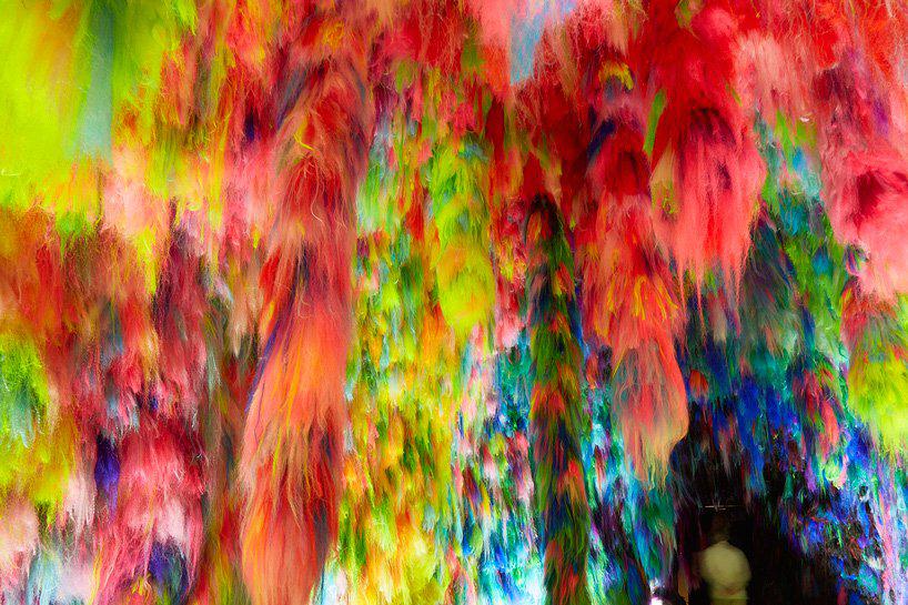 in chromo sapiens, the icelandic artist has created a series of distinct chambers, starting from primal opus, a dark passage of emanating volcanic earthy hues, activated by the sub terra sound of the icelandic cult metal band HAM. a shockingly bright undulation of colored neon hair tufts erupts in astral gloria, the second chamber which, with its soaring cathedral ceiling and sheer emersion of chromatic opulence, generates a kind of euphoric kinetic synesthesia. the exhibition concludes with opium natura, the final cave, which incorporates a soft landing of shimmering whites and pale soothing pastels, invites visitors into a serene, blissful environment before they step out to the busy venetian streets.