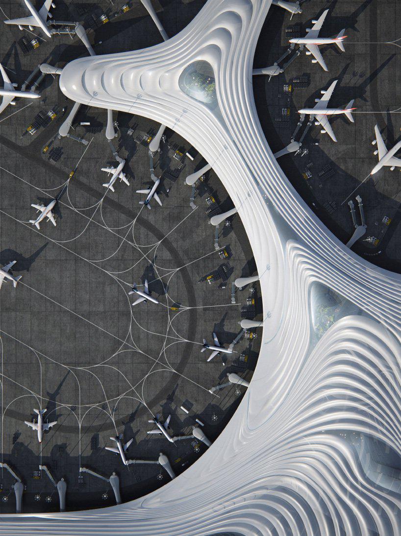 the scheme’s snowflake-shaped, five-finger departure corridors greatly shorten the time it takes for passengers to arrive at their gate, while also minimizing congestion and improving the overall efficiency of the airport apron.meanwhile, ridges on the roof function as skylights, flooding internal spaces with daylight and reducing the need for artificial illumination. the interior is populated with indoor gardens that offer opportunities for reflection and tranquility.