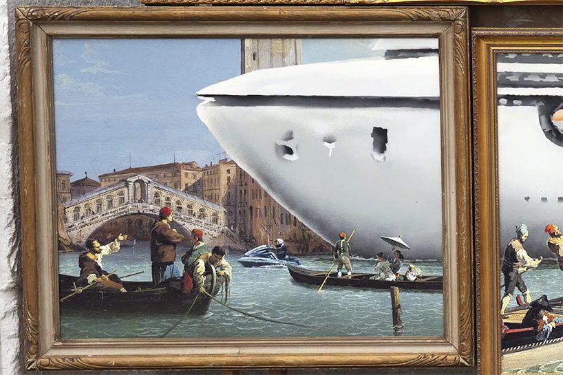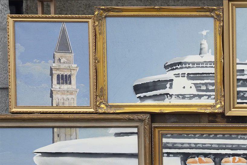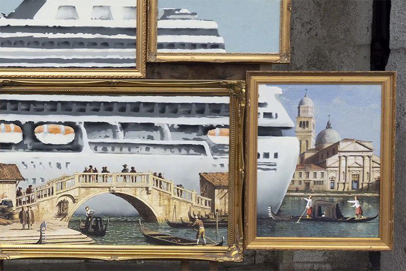 ‘setting out my stall at the venice biennale,’ the anonymous artist writes. ‘despite being the largest and most prestigious art event in the world, for some reason I’ve never been invited.’ a minute-long video documents a concealed man setting up a tableau of framed oil paintings on the streets of the italian city. when assembled, the group of images depicts the ever-controversial cruise ships that dwarf venice’s spectacular cityscape as they make their way past the grand canal.
