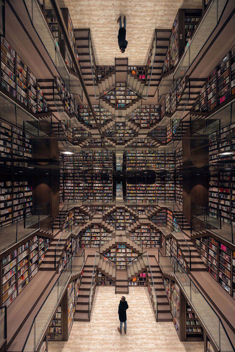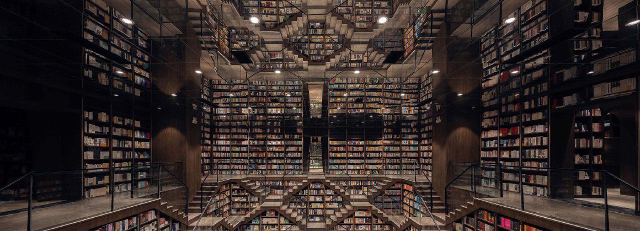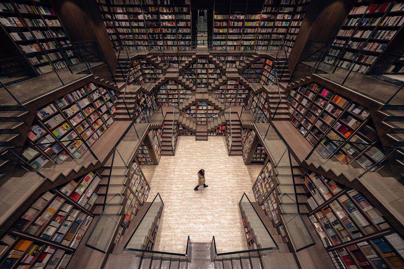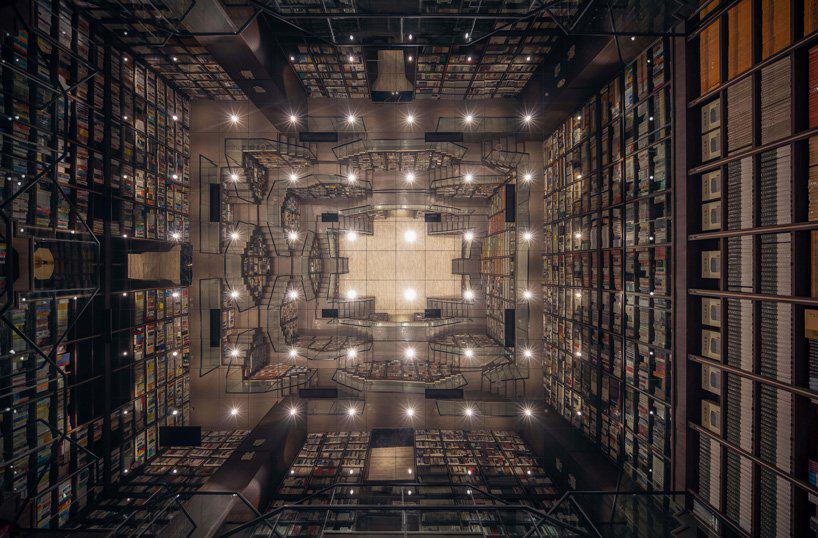 designboom_the chongqing zhongshuge bookstore by shanghai-based firm X+living celebrates the landscape and historical sites of its namesake chinese city, chongqing. the two-floor store invites visitors into a theatrical interior, typical of the studio’s design approach, packed with lampshade-shaped bookshelves, an escher-like reading area, and a colorful children’s room with drawings of the city’s landscape, buildings and transportation.