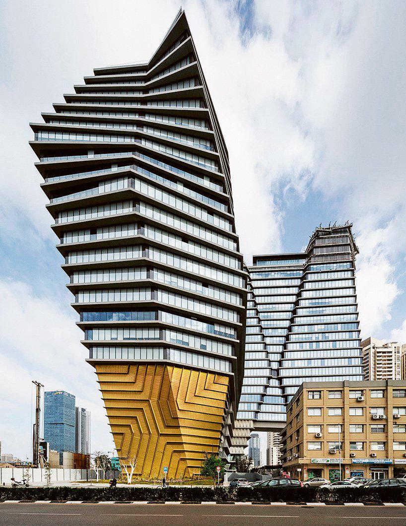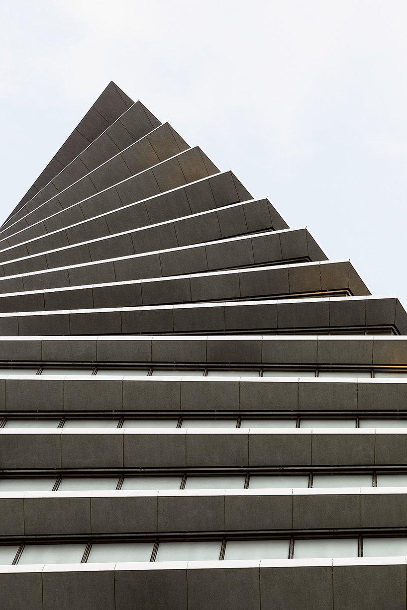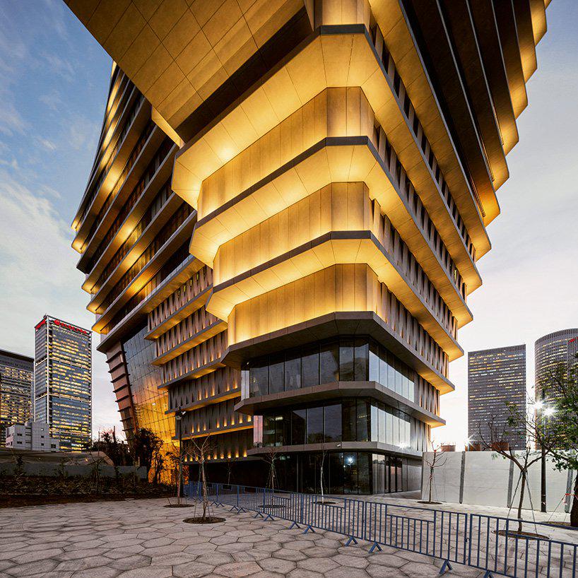 more than 28,000 square meters of dekton by cosentino clad the structure, appearing on the ventilated façades, flooring, elevators, ceilings, and interior partitions. the dekton pieces, fabricated in 10,000 varied shapes, were produced and cut at the cosentino headquarters in spain before being transported by sea to tel aviv. inside, a large 30-meter atrium functions as a lobby and gathering place. the offices, which start at the seventh floor, enjoy views of the city and a centrally positioned courtyard.
