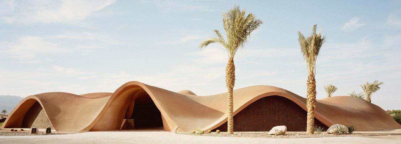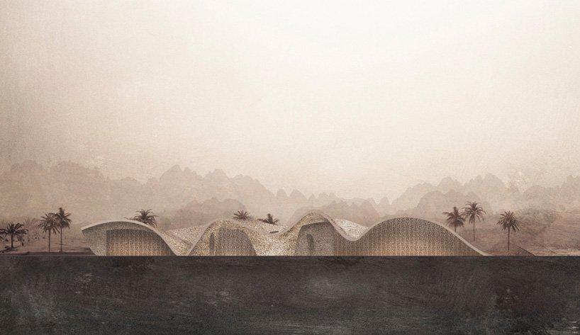 designboom_oppenheim architecture has designed this golf clubhouse to mimic the surrounding desert. set across 13,000 square feet in aqaba, jordan, the building’s unusual form is made up from curving components covered in a layer of unifying shotcrete – sprayed concrete.