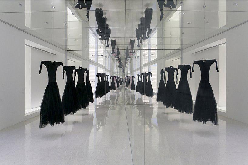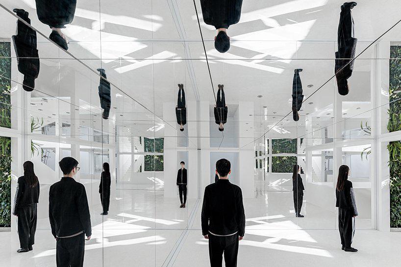 three courtyards connect the interior spaces and bring in ample sunshine and greenery. visitors enter through a daylight-filled yard and arrive at the first floor showroom, where furniture and other products are displayed and sold. surfaces are clad with mirrors that reflect the endless greenery and provide infinite views of each object displayed, creating an illusion between the real and the reflected.