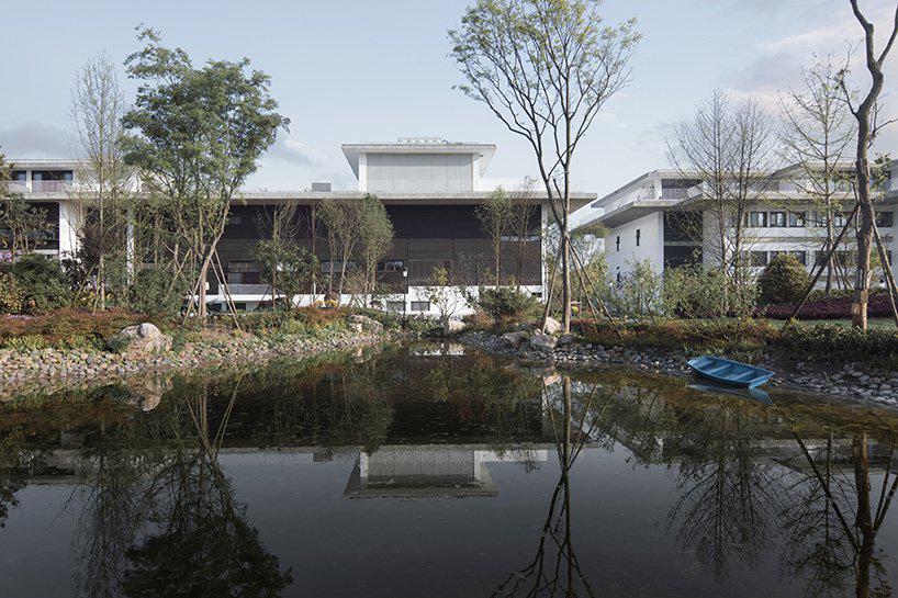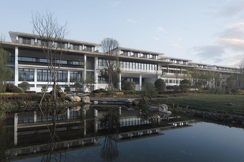 designboom_in a remote part of southwestern china, 200 kilometers (124 miles) from the nearest city, atelier FCJZ has completed a visitor center for a historic liquor brand. the building is located in the town of tuopai zhen, in china’s sichuan province, which has been home to shede spirits for many years. situated in front of the company’s distillery, the visitor center is surrounded by nature — bordering a park on one side and a river on the other.