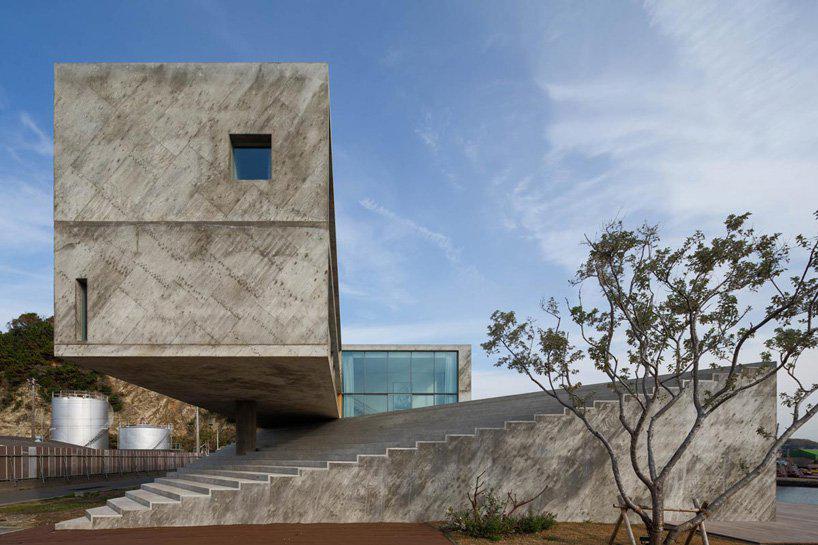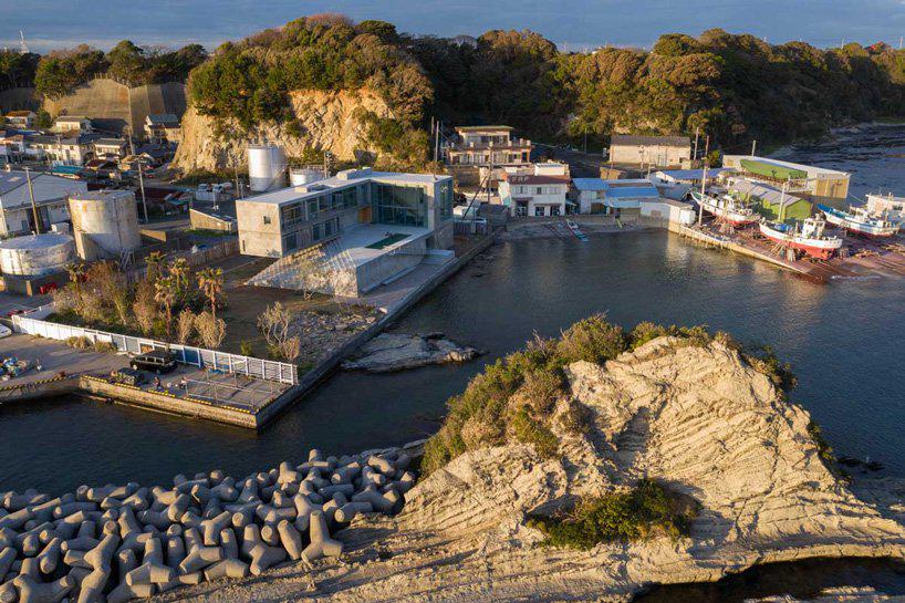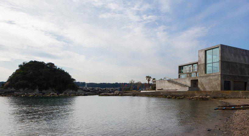 designboom_mount fuji architects studio has built the peninsula house, a three-story concrete residence sitting on a seaside site that faces the ocean to the east in kanto, japan. the monolithic block is designed as if cut out from the rocky mass of the peninsula it’s located on, and characterized by a long blind wall on its main street elevation that is punctured only with the main entrance and a ‘diagonal slit’ that rises to the northeast.
