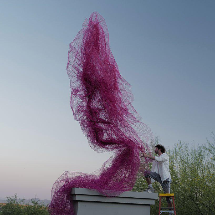 to overcome these pragmatic challenges, benjamin shine worked with a mesh manufacturer to design a net which would fulfill his own requirements. this material was fabricated out of recycled high density polyethylene material — a rigid, tough plastic which serves to mimic the delicate, ghostly qualities of tulle. as a solution to the inherent structural challenges, the artist developed an engineered steel sub-structure which had been carefully designed to remain as invisible as possible while providing the necessary strength. over the course of several months, the monumental fifteen foot sculpture was hand-shaped by the artist through a process of folding and compressing the pliable net material to generate the ethereal form.
