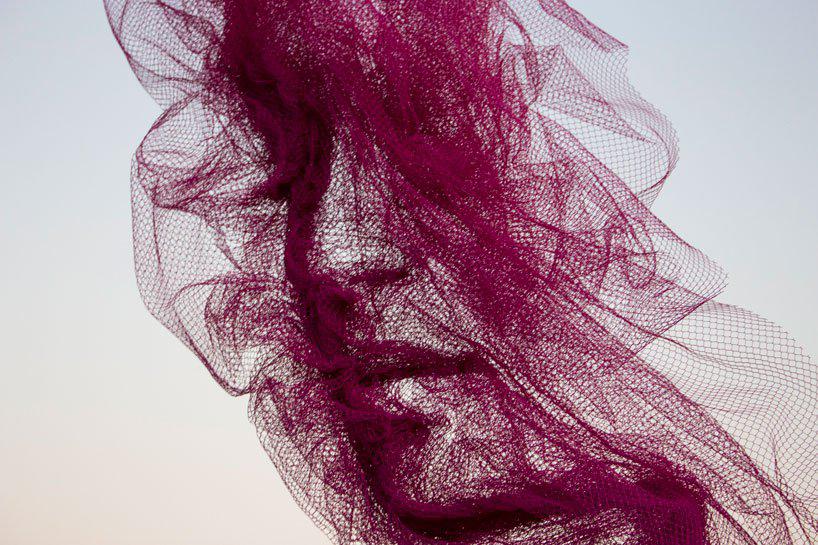 benjamin shine‘s technique of sculpting with a textile medium had developed over several years. the concept of constructing a self-supporting sculpture made from net had been proven to be inherently challenging. aside from the net requiring greater strength to hold its own form, it also needed to provide the same tonal variety as tulle when folded to achieve the details of the face. the net further must be manufactured at a large size of 80 feet by 20 feet as a single piece. despite numerous tests, no commercially available nets or mesh materials fulfilled this criteria.