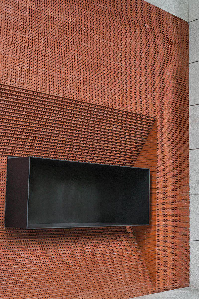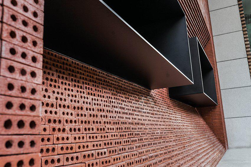 the façade of the building is built from sintered bricks produced by kiln roasting. the color is simple and natural, which forms a strong impact on the street elevation. in addition, the raw brick material is taken from natural clay, argil and shale, meaning that after the service life of the building, it can be crushed and recycled to make brick products again. therefore, the project also promotes ideas of sustainability while creating a new architectural intervention in zhujiang new town.