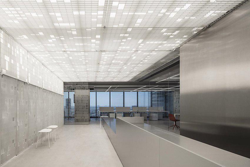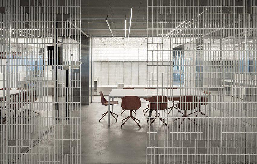 the steel grate was unraveled to create a new pattern and be transformed from a simple grid to an industrial lace.this woven-like partition created divisions without blocking the space. the openness of this so-called weave allowed for subtle, layered views of the cityscape around. the white corrugated polycarbonate sheets were designed as more assertive divisions that give more privacy.