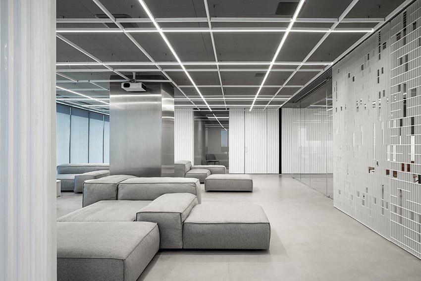 the concept of the grid and its deconstruction was also incorporated into the lighting plan. a new grid was introduced, creating of a combination of white aluminum profiles and led lights. the grid of light stretches above the entire space further asserting the free-flowing layout. the reception area was accentuated with light as well where the deconstructed welded grates’ ceiling in that area was backlit, creating a lucent canopy above the space.
