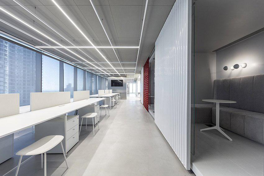 the office’s color palette is mostly white and grey with red accents drawn from the company’s branding. the materials palette is a fusion of the sleek and the industrial – aluminum cladding of columns and walls, juxtaposed with concrete floors and the partitions of unraveled welded grates in white paint finish and white corrugated polycarbonate sheets.