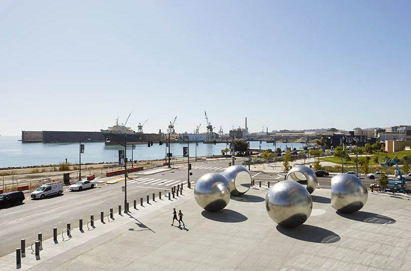‘seeing spheres is a public space that contains you and contains multitudes,’comments eliasson.‘we often think of public space as empty, negative space in the city, viewed from a car or crossed on the way to somewhere else. seeing spheres offers a place to pause, where you see yourself from the outside, as a participant in society.’
