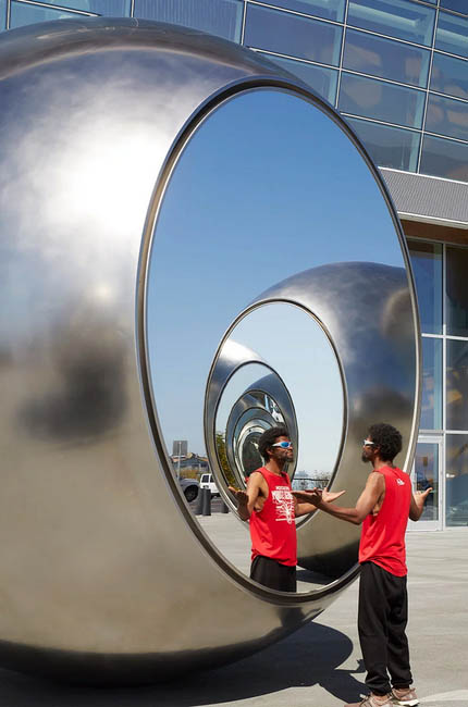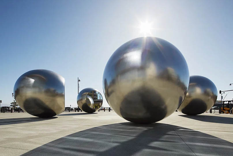 Designboom- heralded as one of the most influential artists of his generation, olafur eliasson unveils his first permanent public artwork on the west coast of the united states. located at the golden state warriors and chase centre in san francisco, seeing spheres, 2019, consists of five fifteen-and-a-half-feet-tall polished hydro-formed steel spheres that stand in a circle around a central space.
