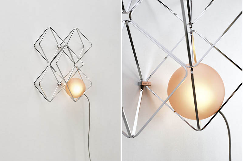 The wall light is made from five minimalist frames that are joined together in a single module, allowing five glass spheres to be included, which rely on nothing more than gravity to stay in place.