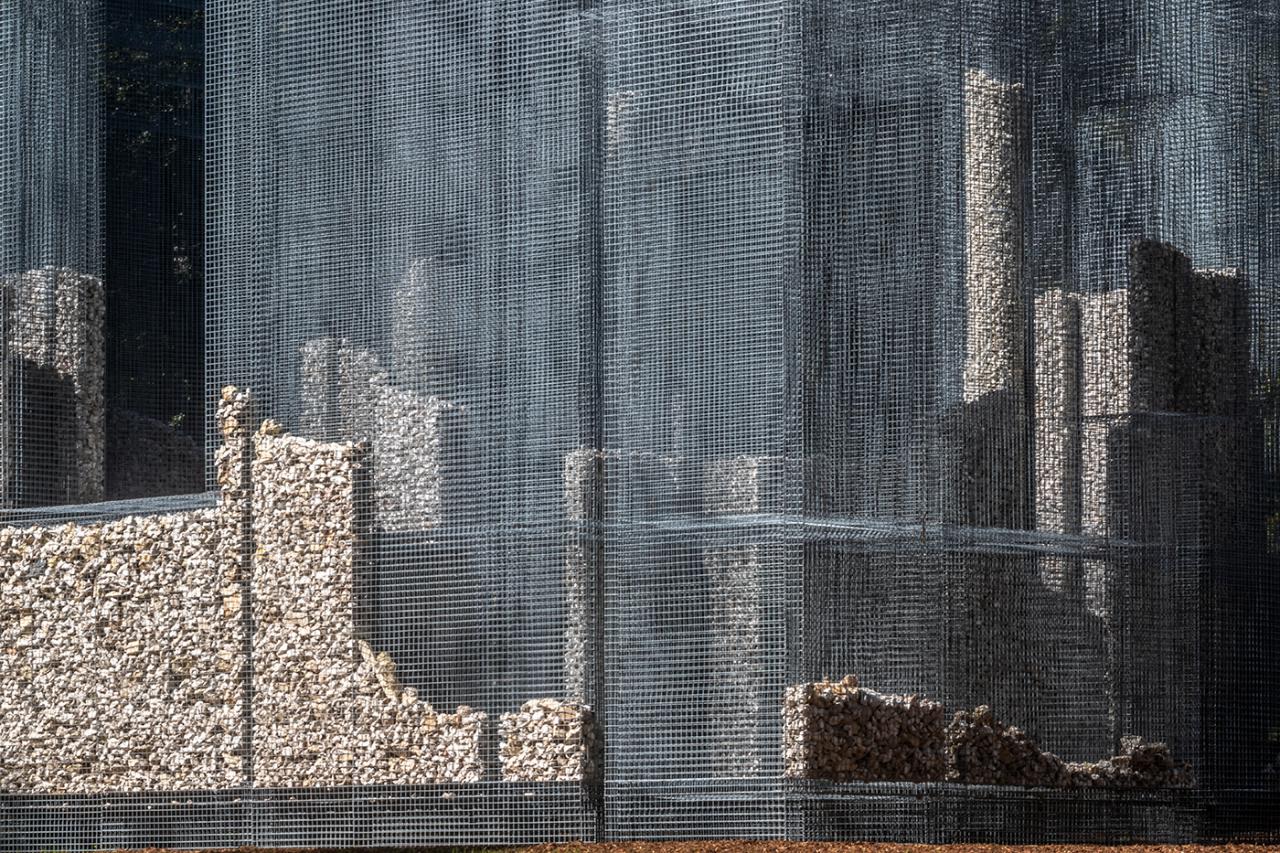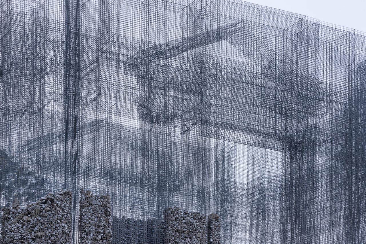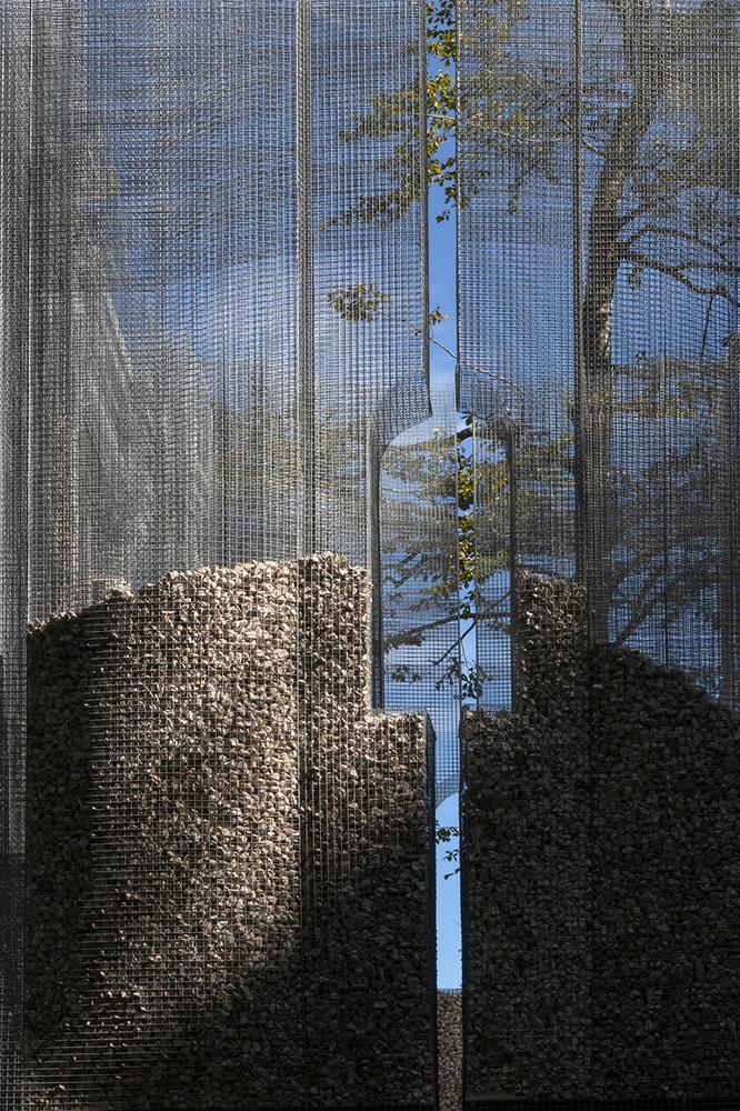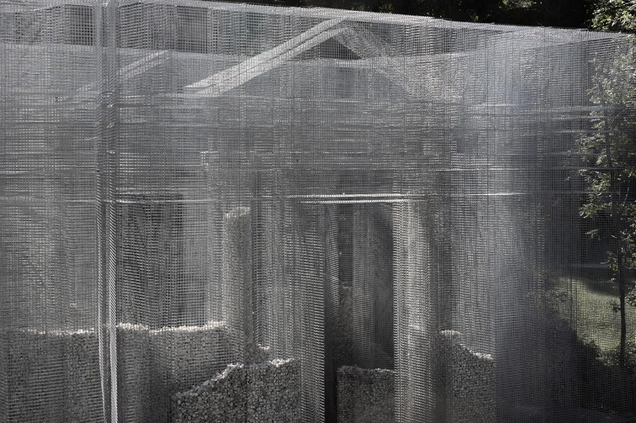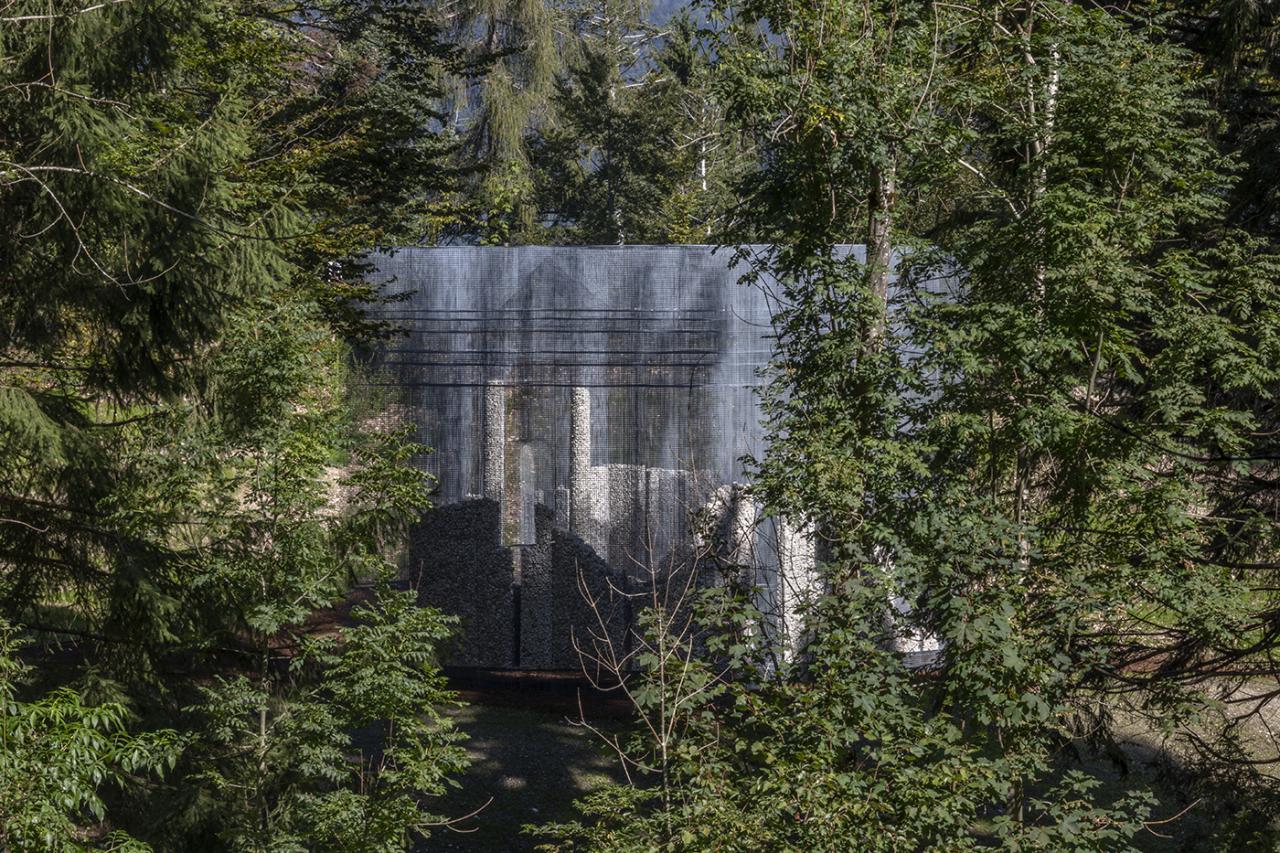 Through Simbiosi, the artist, for the first time, “hybridizes the transparency of the Absent Matter, expressed through the wire mesh, with the materiality of local stones”. The architectural installation generates a space of rest and meditation, an open space to the skies, “a ruin suspended between architecture, nature and temporal dimension”. In deep connection with Arte Sella Park, Simbiosi is located on a hill that did not exist prior to the storm of 2018.