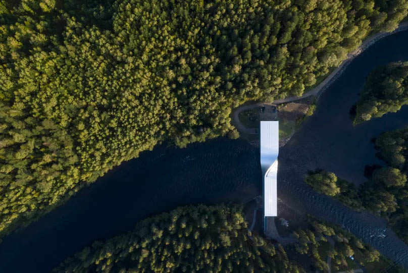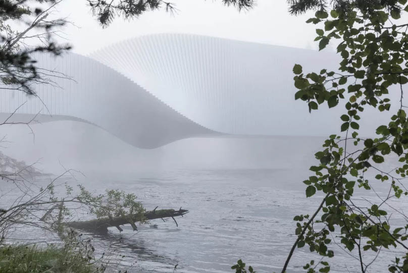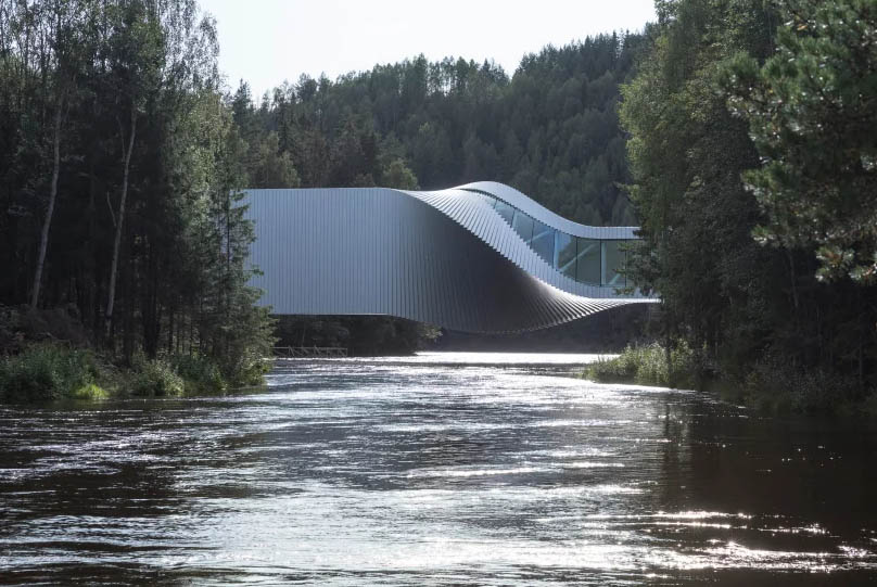Designboom_ spanning the winding randselva river, a unique new building connects two forested riverbanks at kistefos — northern europe’s largest sculpture park. part museum, part bridge, and part sculpture, ‘the twist’ has been designed by bjarke ingels group (BIG) and represents the firm’s first project in norway. dramatically torqued at its center, the structure not only allows visitors to cross from one riverbank to the other, but is also capable of hosting an international program of contemporary art exhibitions.