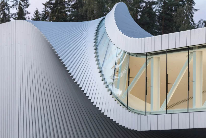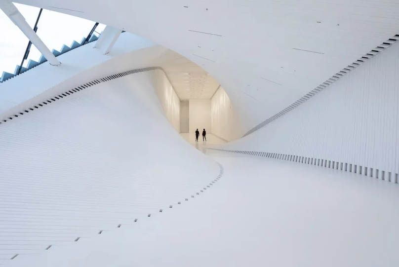 straight aluminum panels — developed in collaboration with baumetall — have been arranged like a stack of books to create the museum’s double-curve geometry, with the same principle used internally. ‘wherever you look, you see arches and curves, fibonacci spirals and saddle shapes, but when you look closer you realize that everything is created from straight lines — straight sheets of aluminum, straight boards of wood,’ ingels continues. ‘an expressive organic sculpture composed of rational repetitive elements.’