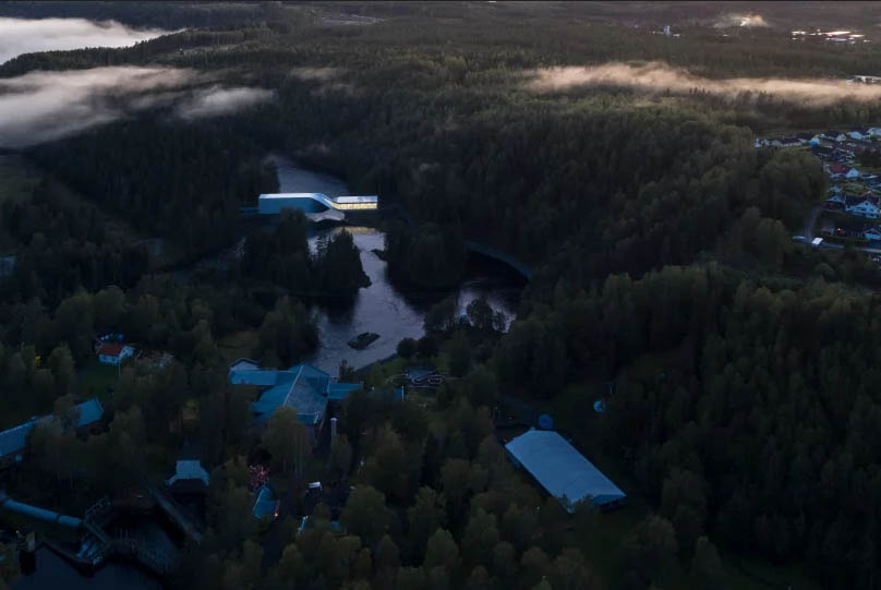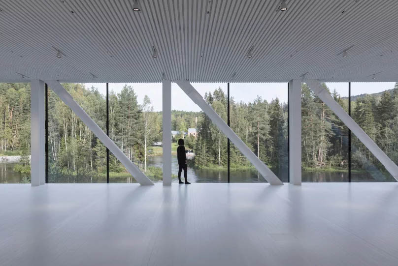 conceived as a ‘continuous path in the landscape’, both sides of the building serve as the main entrance. from the south, visitors enter through a dramatic double-height space with clear sightlines through the entire building to the north entrance. conversely, guests arriving from the north enter into a panoramic space with views of the site’s pulp mill and the surrounding landscape. the different types of daylight entering through the curved glass windows creates three distinctive galleries: a wide, naturally lit gallery with panoramic views on the north side; a tall, dark gallery with artificial lighting to the south; and, in between, a sculptural space with a twisted sliver of overhead light.