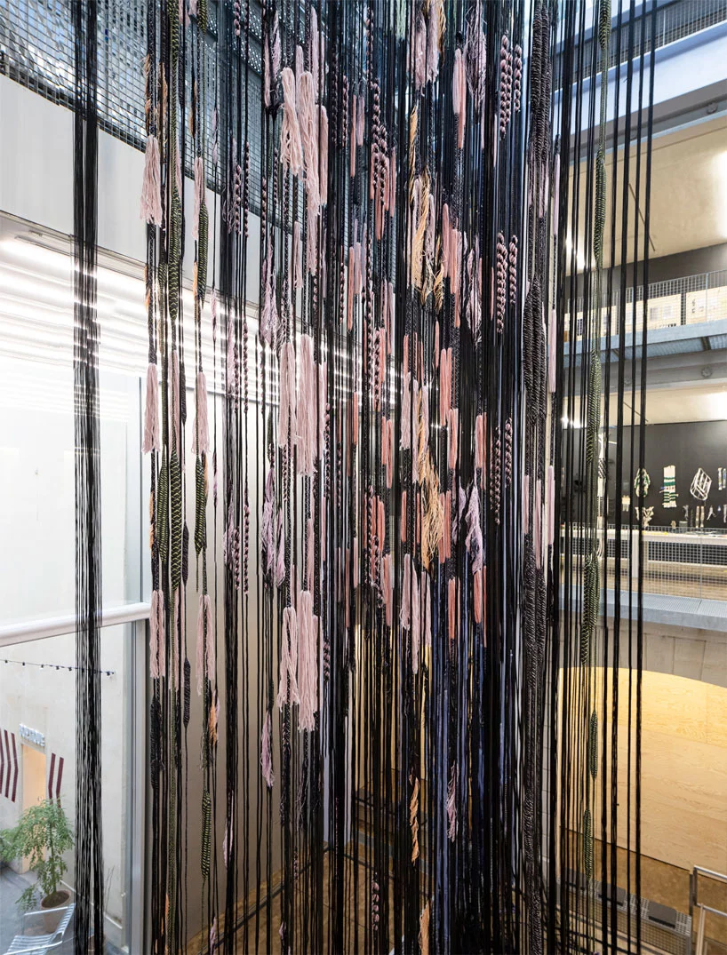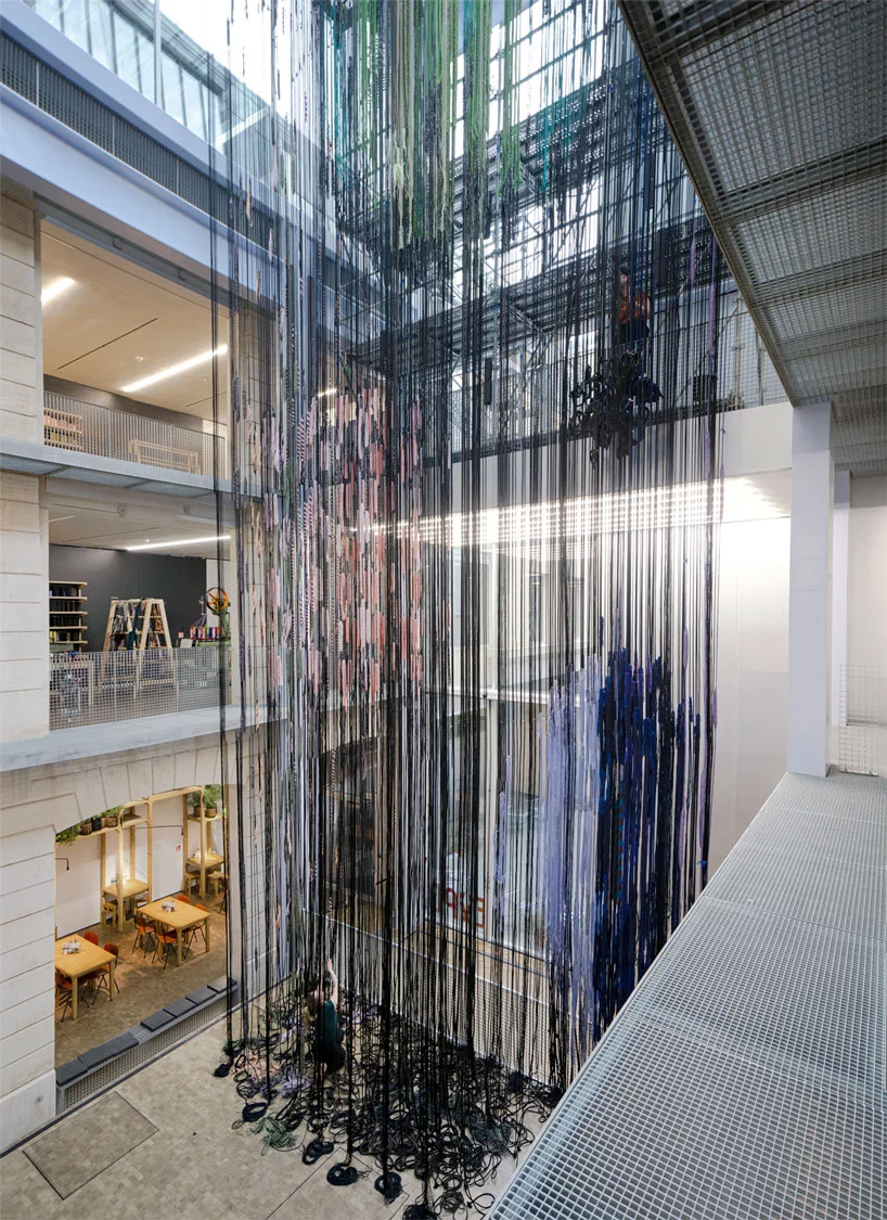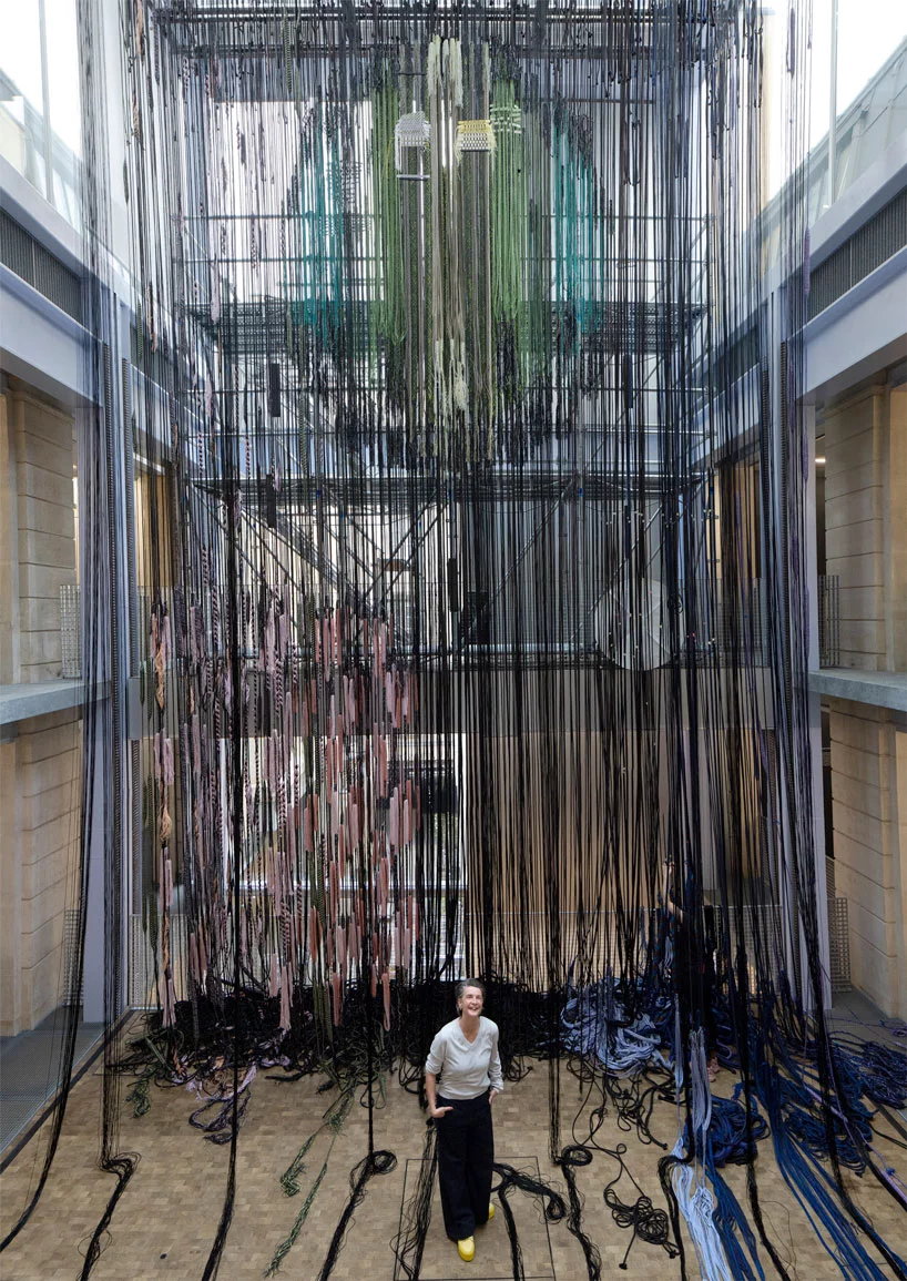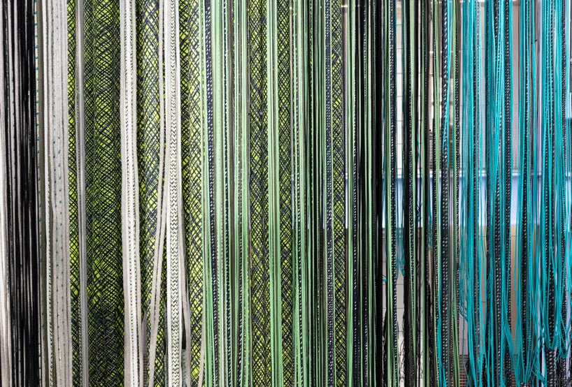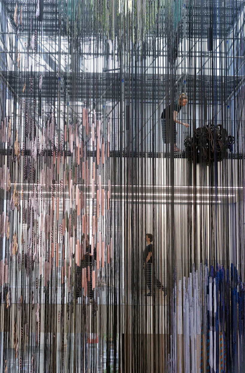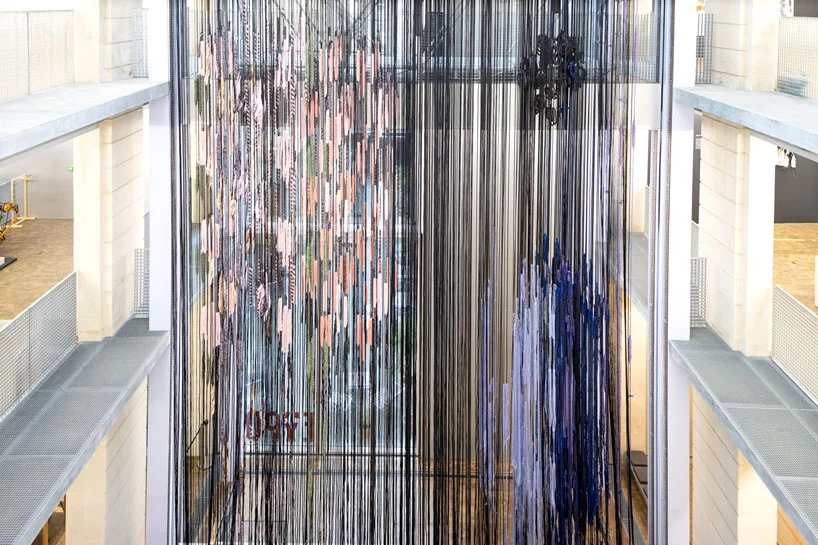 designboom_ throughout summer 2019, lafayette anticipations in paris presents the experimental textile work of dutch designer hella jongerius. with the exhibition entitled ‘interlace,’ the artist makes use of the building’s performative qualities to transform the interior into a vast, constantly shifting loom — a massive textile studio open to the public. hella jongerius is one of international design’s most influential figures. working from her jongeriuslab in berlin, her theoretical and experimental research explores multiple themes, often addressing the significance of colours and materials. the project she has imagined for lafayette anticipations is centred around textile and weaving.