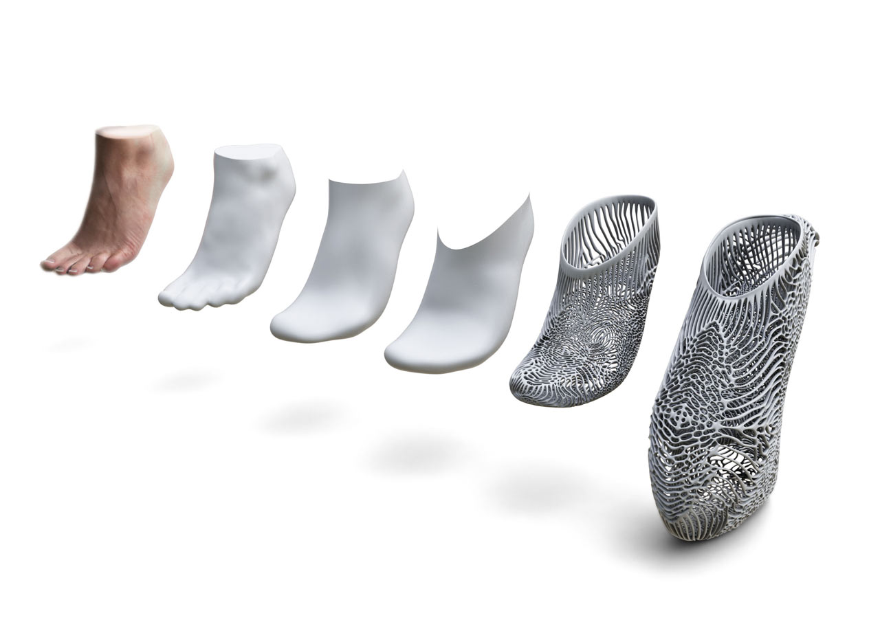 The Mycelium Shoe benefits from the latest 3D printing has to offer. First, the future wearer downloads the app and uploads a series of photos of their feet. Their algorithm then creates a 3D sketch that allows for fit improvements before 3D printing and finishing with automotive grade technologies that make up the final structure.