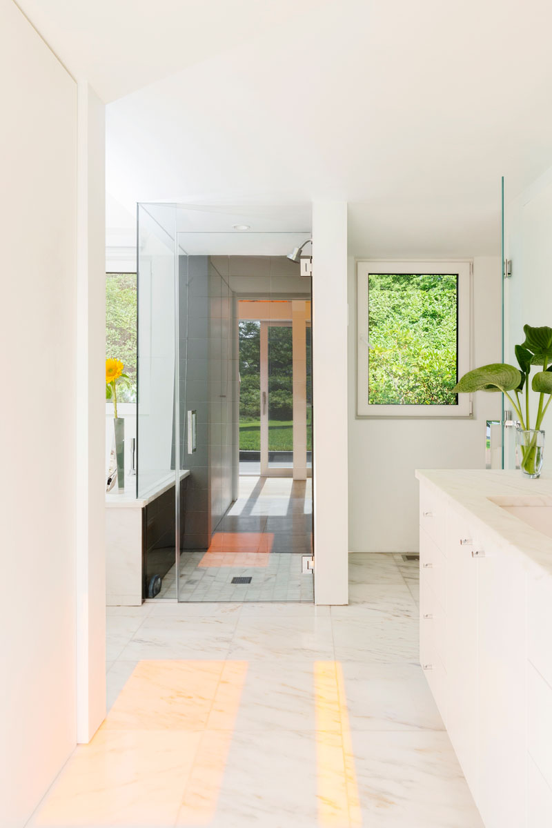 At the end of the hallway, there’s the master bedroom that has floor-to-ceiling windows. The bedroom is also open to the built-in bath