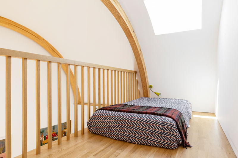 The loft brings the total number of bedrooms in the house to three. The loft also receives plenty of natural light from the skylight, while curved wood beams show off the shape of the ceiling.