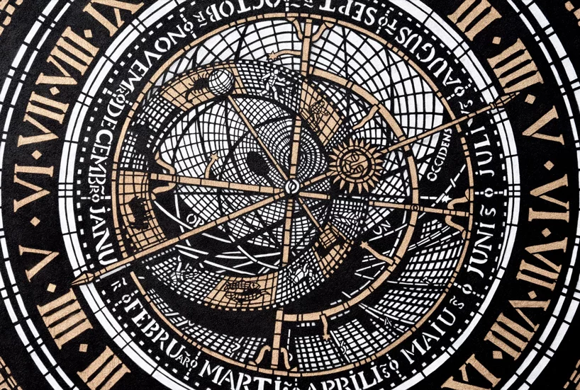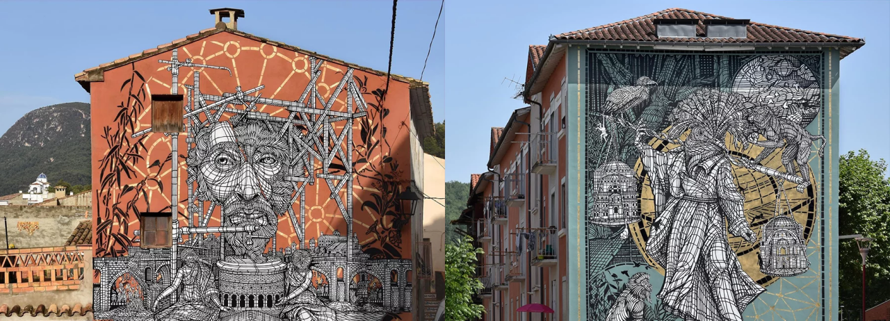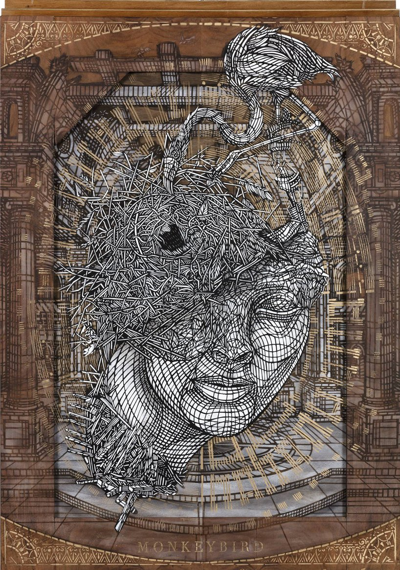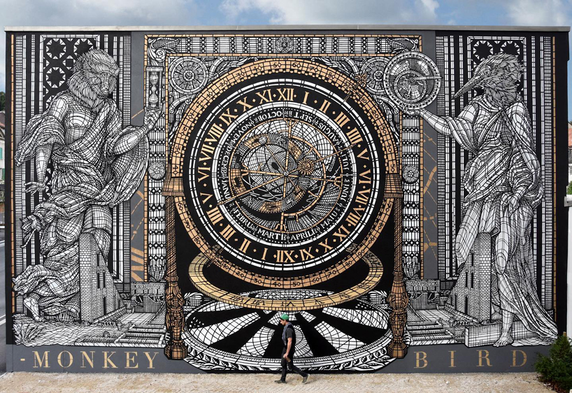 designboom-monkeybird is an anonymous duo of french contemporary artists who create large-scale murals that feature elaborate symbolism and mythical creatures. depicted in black-and-white cross-contour lines with golden accents, their mission is to transcribe social themes into the exterior walls of museums and other institutions.