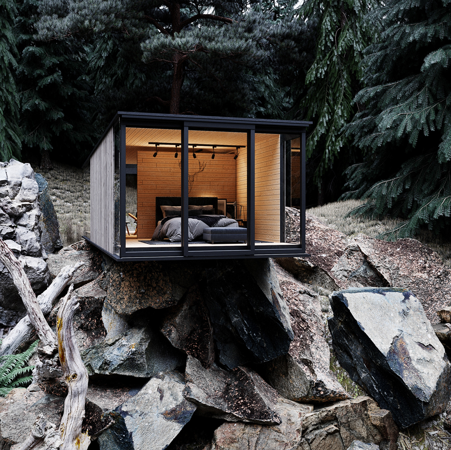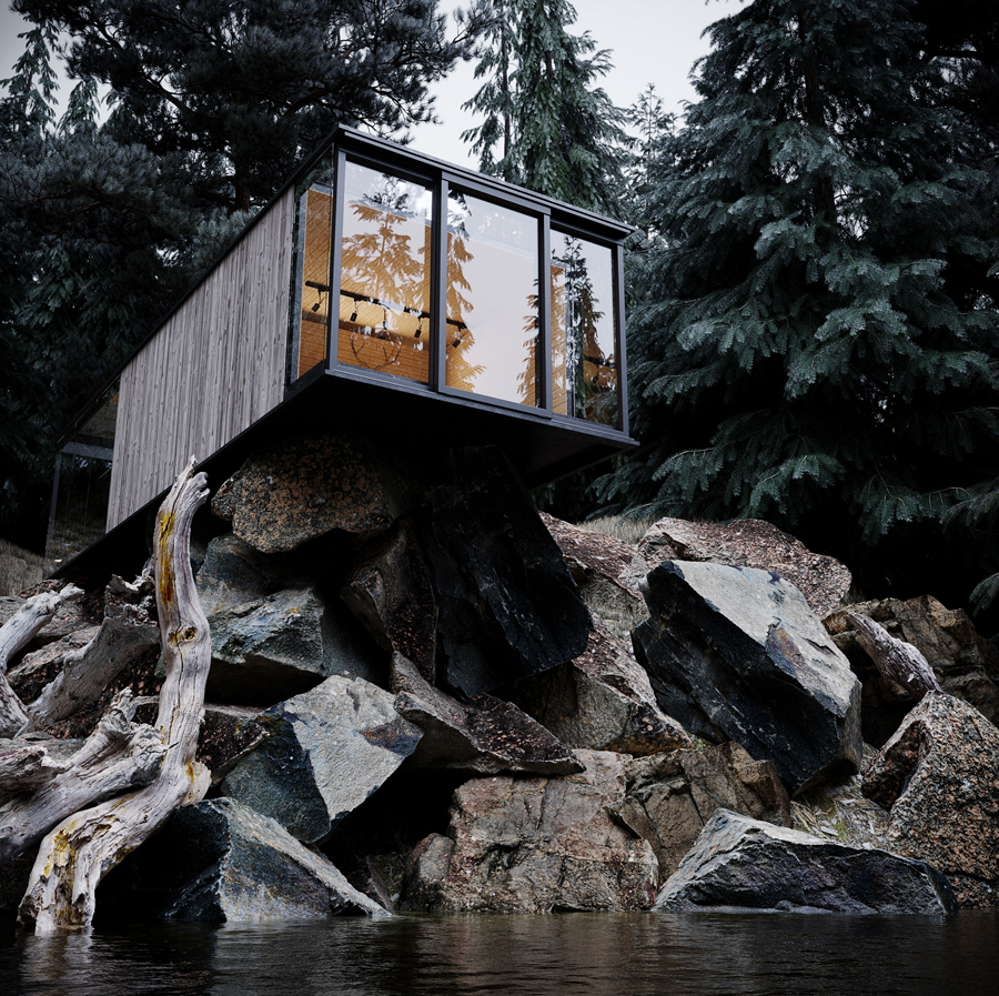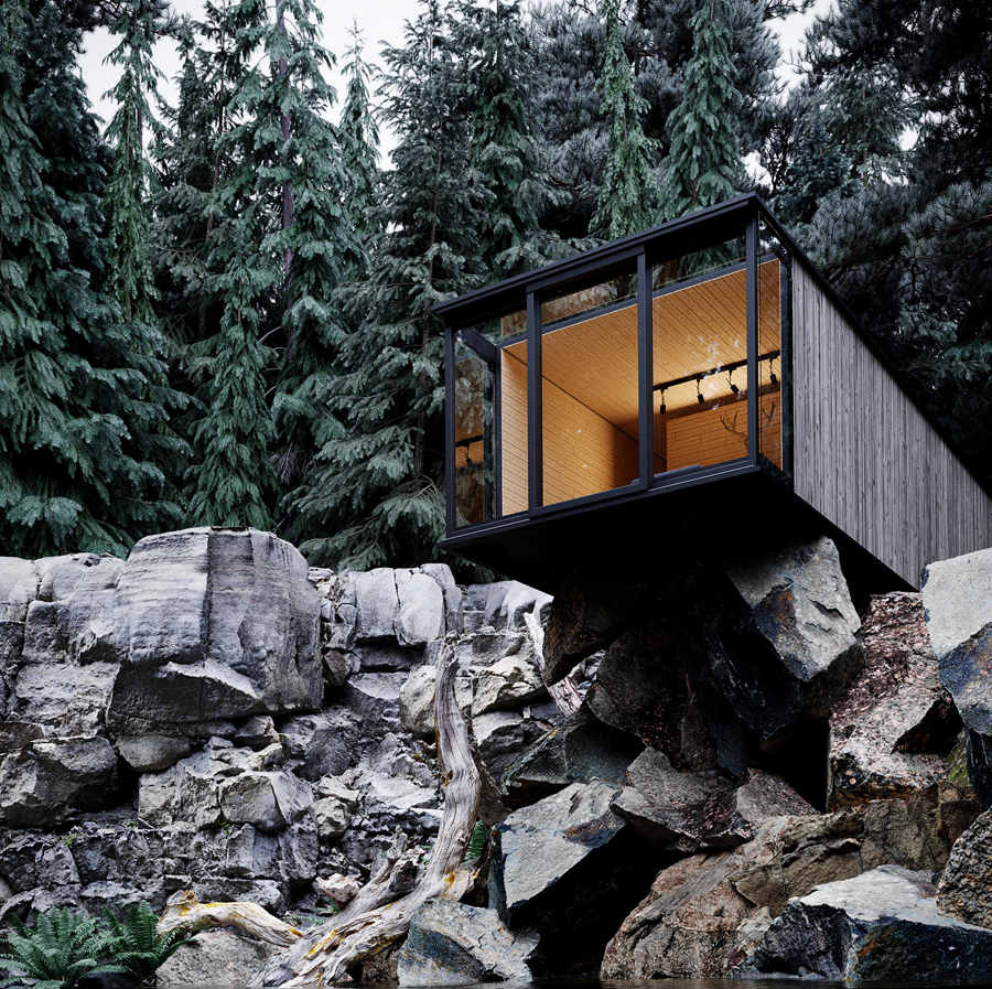 Nestled within a jagged outcrop of moss-covered rock, the artist’s stirring “House In The Woods” forbodes a dark, isolated existence – expanding subtly over shadow-strewn waters and providing an explicit view of the surrounding treeline via framed, geometric windows. An uncured, worn-wood facade adorns the exterior of the dwelling, demarcating the home’s rustic roots, while a sparsely lit and furnished interior provides a serene, melancholic atmosphere. Dimitrov’s “House In The Woods” is merely the personification of nature’s untamed propensity to both heal and mesmerize – soliciting thoughts of mystery, disorientation, and introspective design.