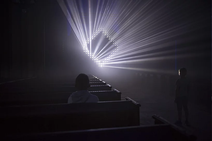 designboom-presented by TETRO+A during 2019’s ‘constellations de metz’, guillaume marmin has created a light installation entitled ‘1.3 SECONDE’. for the third year of the digital arts festival in the french city of metz, the project has taken over the architecture of saint vincent’s basilica, illuminating the architectural details of the gothic church. constructed using 250 projectors, the concept behind the work intends to celebrate the first steps on the moon by immersing visitors in a scene of light and sound.