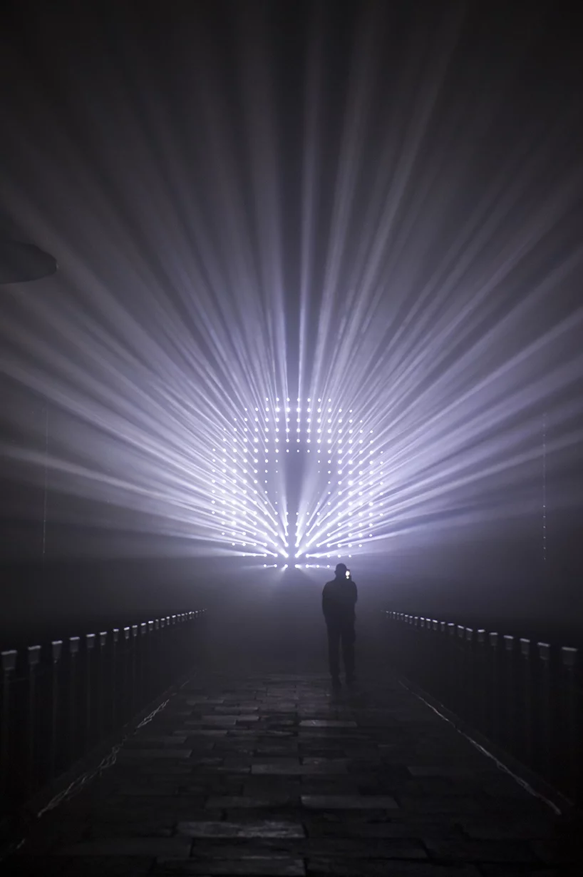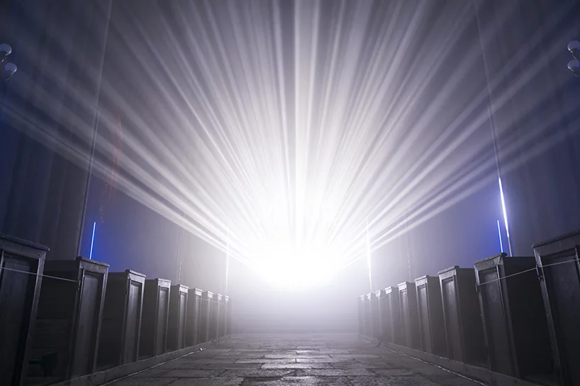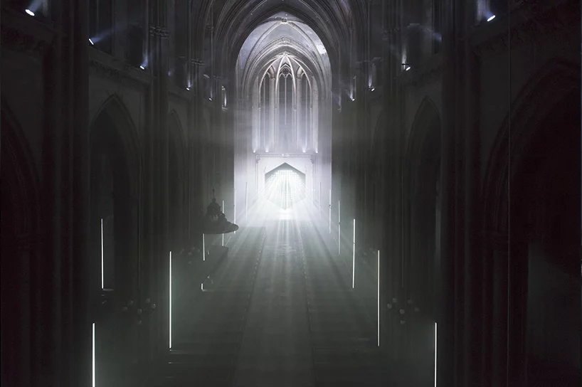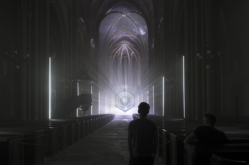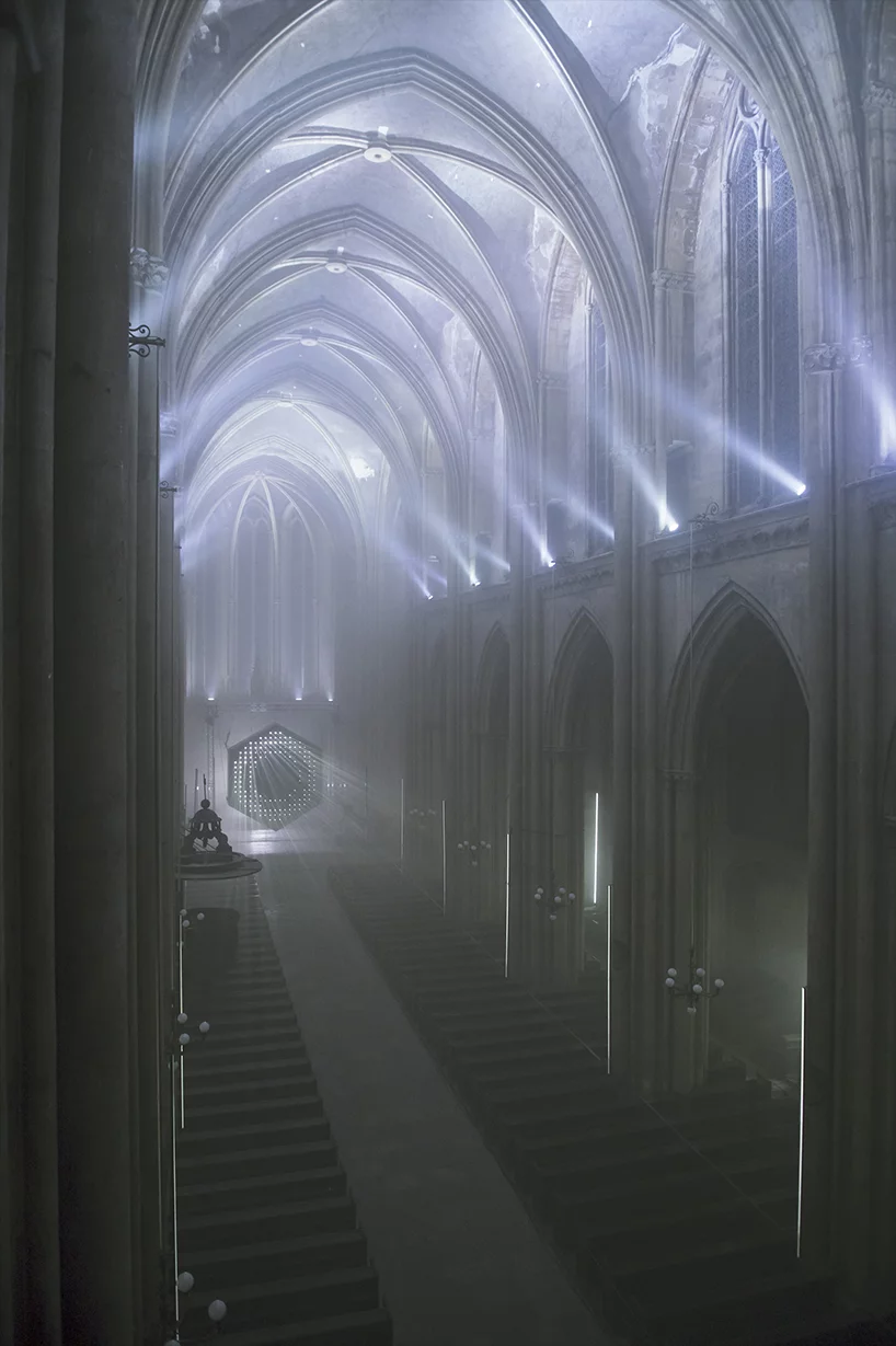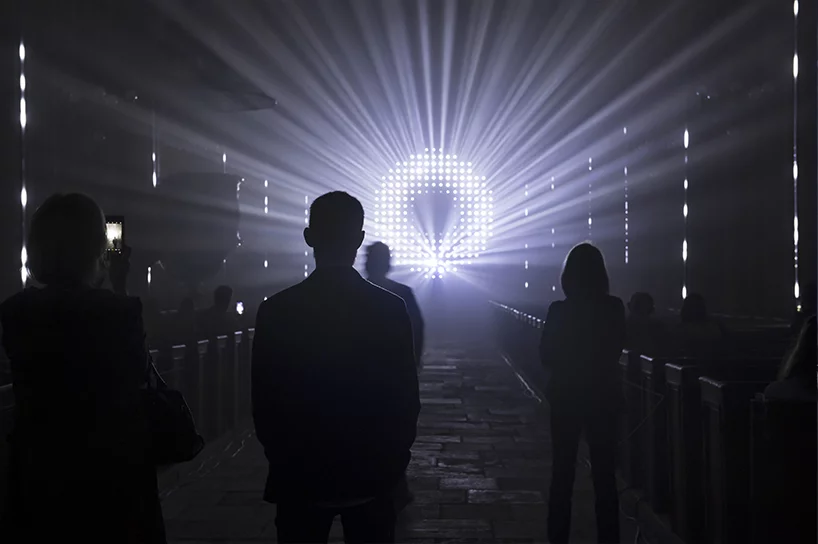 with the space travel theme in mind, the installation by marmin and TETRO+A gets its name from the time it takes for light to travel from the earth to the moon at a velocity of 300 000km/s. inspired by the church’s columns, stained glass windows and overall gothic style, visitors are given glimpses of the architectural details as lights flash and illuminate the grand space of the basilica. the contrast between the darkness and flashes of light immerses the audience in an almost overwhelming experience that intends to play with the perception of the existing space.