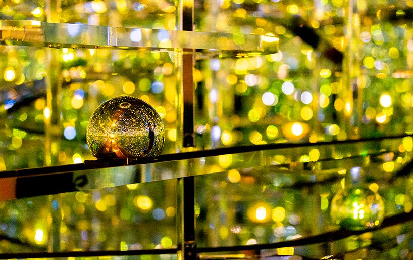 the immense light sculpture made up of more than 1000 moving lights, ‘microcosmoses’ world will be ‘an experience as yet encountered by humanity’, describes teamLab. the autonomous light vehicles, in the form of a glass sphere, move simultaneously throughout the space on a rail. the vehicles change speeds and colors in response to each other within proximity and depending on its battery life. when people stand close to a vehicle, it will shine brightly and emit sound tones in response to the person’s presence. as the combination of color, speed and sound vary by the second, every visitor will have one of a kind, unique experience.