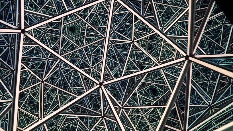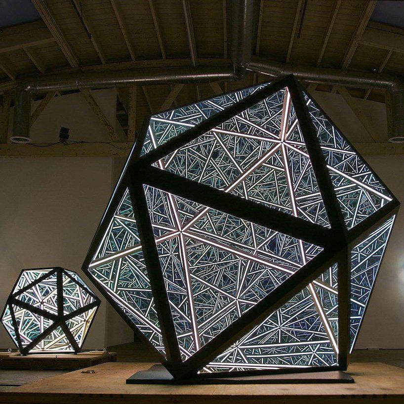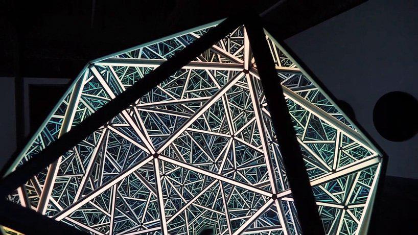 Designboom_sculptor anthony james immerses viewers in an otherworldly universe of neon light. his portal icosahedrons – twenty-sided light installations – are made up of repeating equilateral triangles that layer over one another in reflection to create a mesmerizing matrix of glowing LEDs.