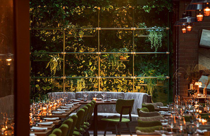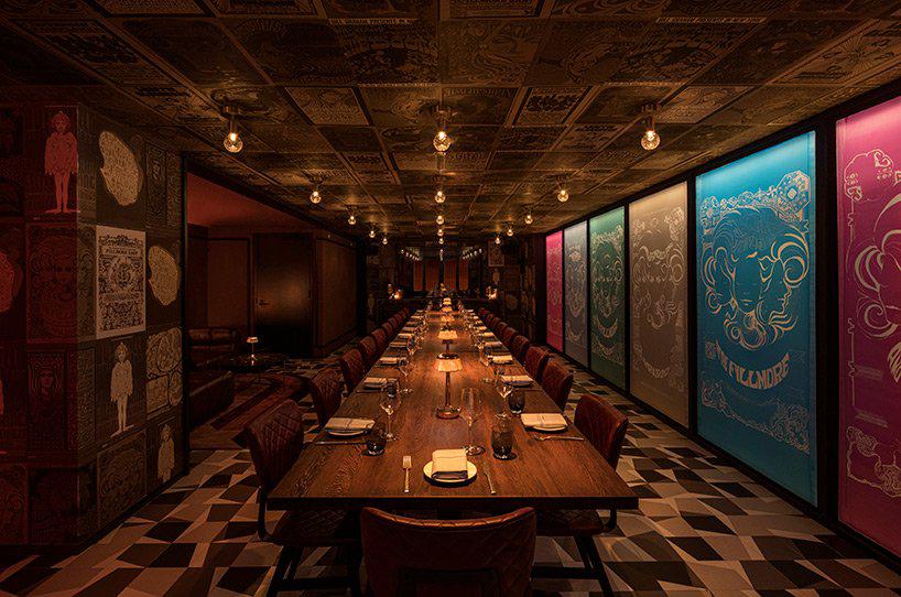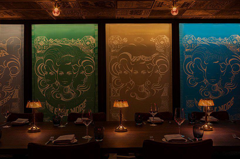 cathédrale also includes an open kitchen with copper accents and a bar area with distressed plaster walls and neon signs that reference east village hotspots. ‘the poster room’ — a private dining area — immerses diners in the psychedelic rock era with its walls and ceiling lined with backlit screen prints of vintage concert posters.