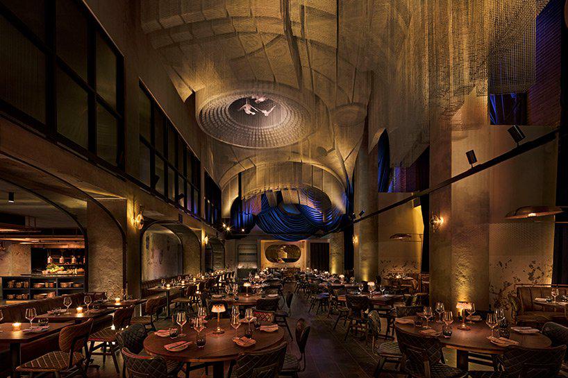 DESIGNBOOM_inside the rockwell group-designed moxy east village hotel, italian artist edoardo tresoldi has installed an ethereal sculpture that floats above the main dining room at cathédrale — the hotel’s landmark french-mediterranean restaurant. infilling the triple height domed ceiling is tresoldi’s signature wire mesh piece called ‘fillmore’, which pays homage to new york’s legendary fillmore east, a venue widely revered for its medieval revival architecture. the 19-foot installation evokes the grandeur of the past, and creates a dramatic dialogue with the restaurant’s architecture and interior design.