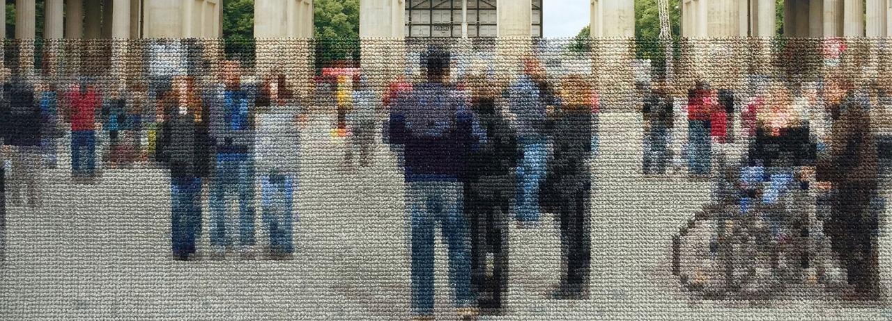 obscuring sections of the images using by sewing cross-stitch embroidery directly onto the photograph, the obstructed elements represent the exact scale and location of the former wall. offering a blurred view of what lies behind, the embroidery is made to resemble pixels and borrows the visual language of digital imaging in an analog, handmade process.