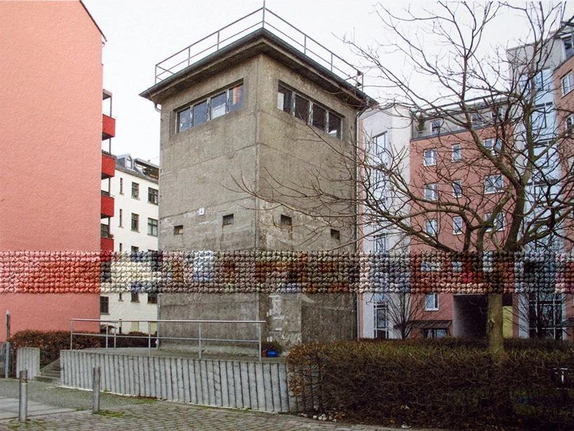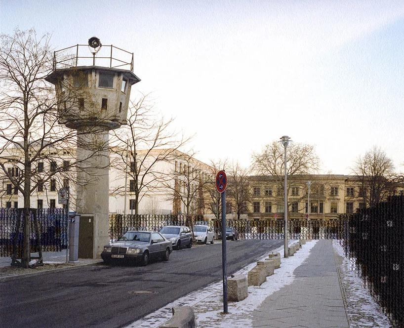 designboom-in her series ‘berlin’, artist diane meyer has hand-sewn 43 photographs with embroidered elements that represent the former wall dividing the city. the series, titled ‘berlin’, overlays various elements in the images with each section of embroidery illustrating where the divide would have bisected or blocked views. the images are from a series of hand-embroidered photographs following the entire 104-mile circumference of the berlin wall.