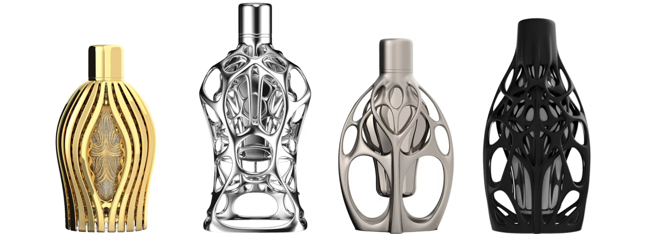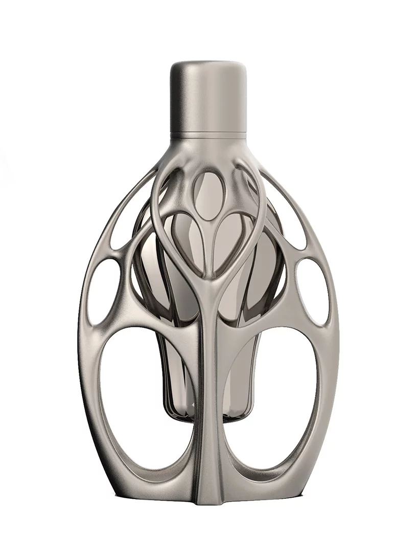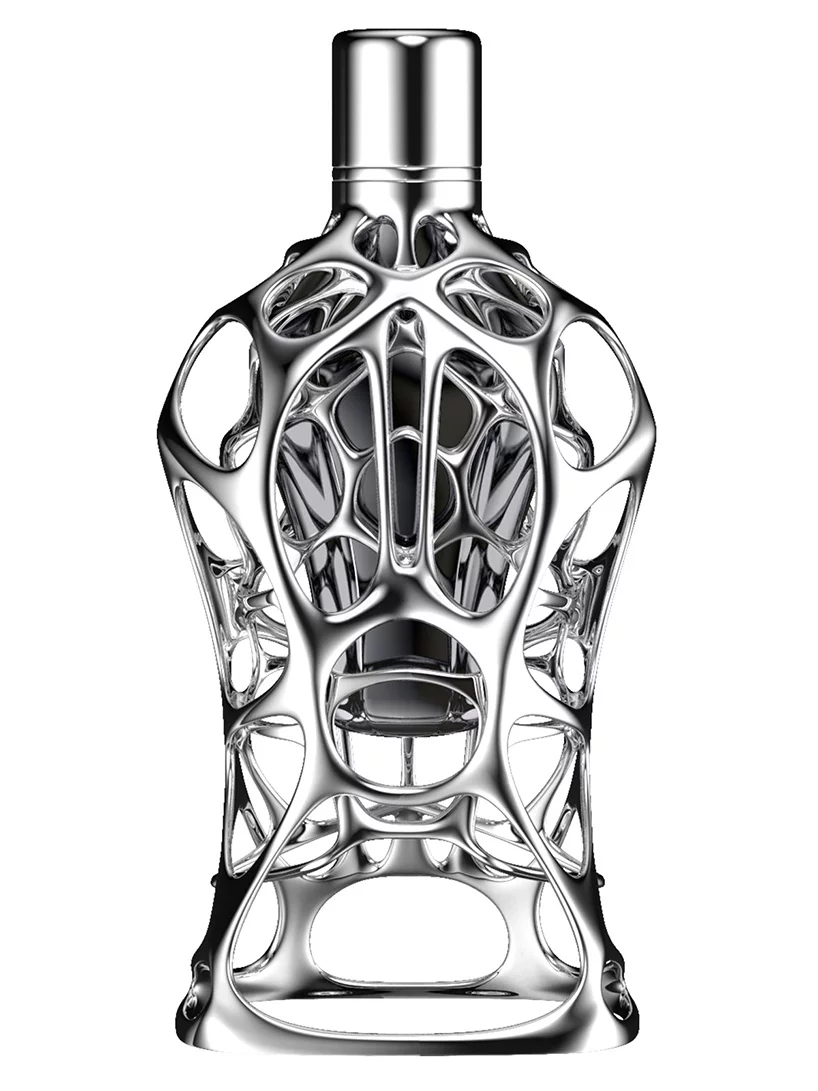 designboom-agile embrace, compact suspension and fluid symmetry are the three principles these 3D-printed blasted titanium perfume bottles by ross lovegrove embrace. created in collaboration with designer parfums for formula 1, the fragrances were launched at the last race of the decade, the formula 1 etihad airways abu dhabi grand prix 2019.