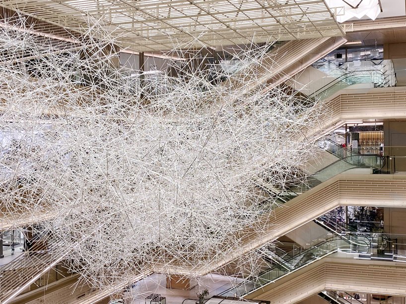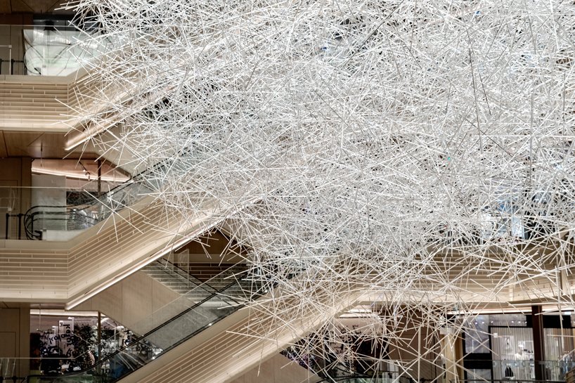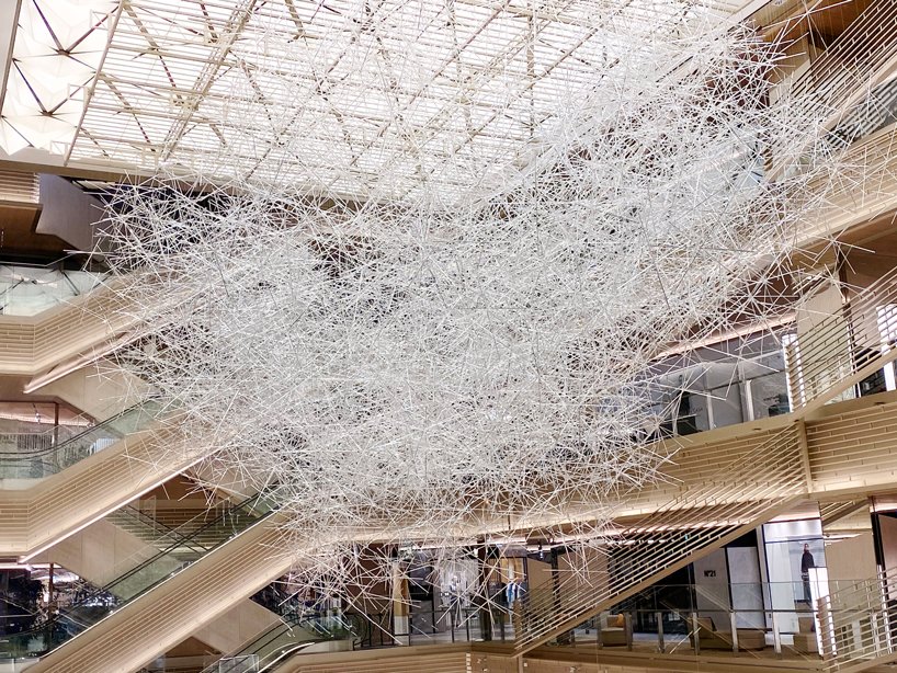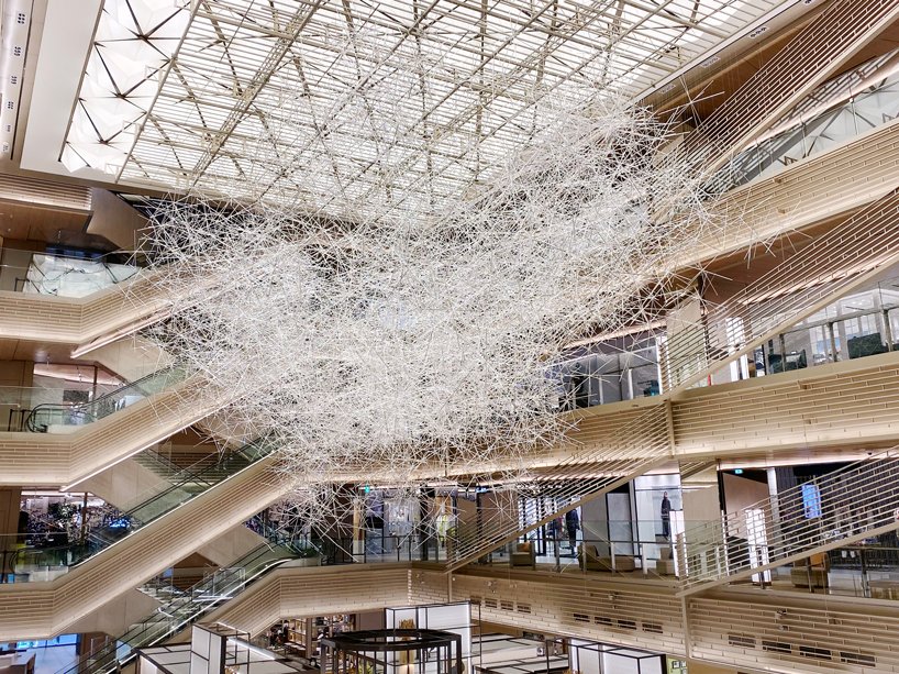 Designboom_an installation of more than approximately 10,000 colorless prism rods forms a gigantic sculpture of light by tokujin yoshioka. the enormous sculpture is on display at GINZA SIX, a luxury shopping complex located in the ginza area of tokyo. using barely-visible cables, the colourless rods are hung from the roof and stacked together in a formation that is designed to resemble a cloud.
