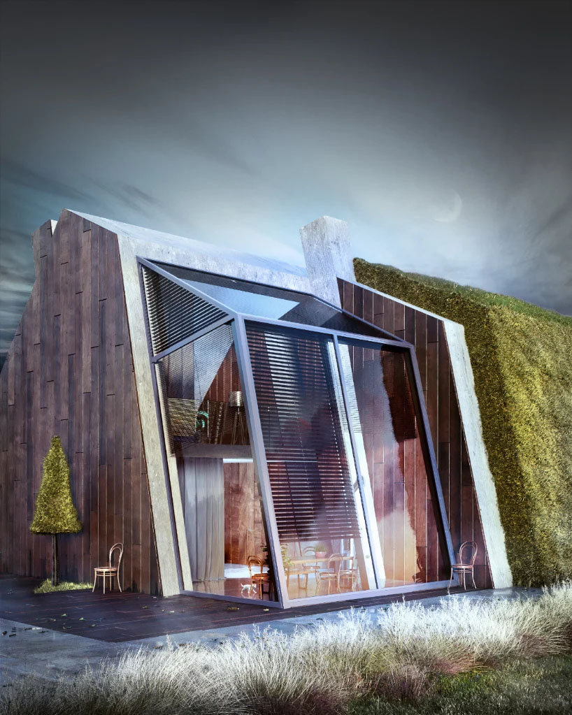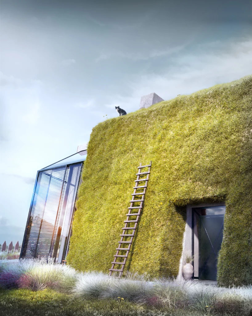 Designboom_ karina wiciak of wamhouse studio has envisioned ‘greenhouse’ – a modern cottage and holiday home inspired by the traditional barn architecture of polish villages.as the name suggests, the house is designed for a rural location, with grass covering parts of the walls and roof structure, seamlessly blending into the countryside context. the conceptual project also makes reference to deconstructivism, much like ‘pentahouse‘ – the previous work from wamhouse studio.