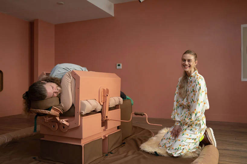 the compression carpet is a continuation of the artist’s compression cradle, a machine that had a similar effect on the body by using a sequence of aerated volumes. tightening around the body as they deflate, the device aimed to assist in altering the expression of oxytocin — a hormone released in the brain responsible for building trust and pair bonding. mcrae created the piece for broken nature: design takes on human survival, the triennale di milano exhibition curated by paola antonelli.
