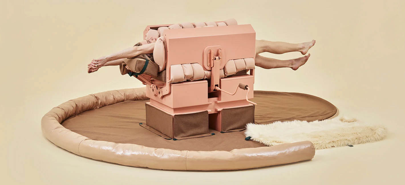 Designboom_ artist lucy mcrae has created a machine that mimics the positive effects of a human hug. the ‘compression carpet’ requires two people to operate, including someone to lie down inside the device and another to turn a crank that slowly increases pressure.