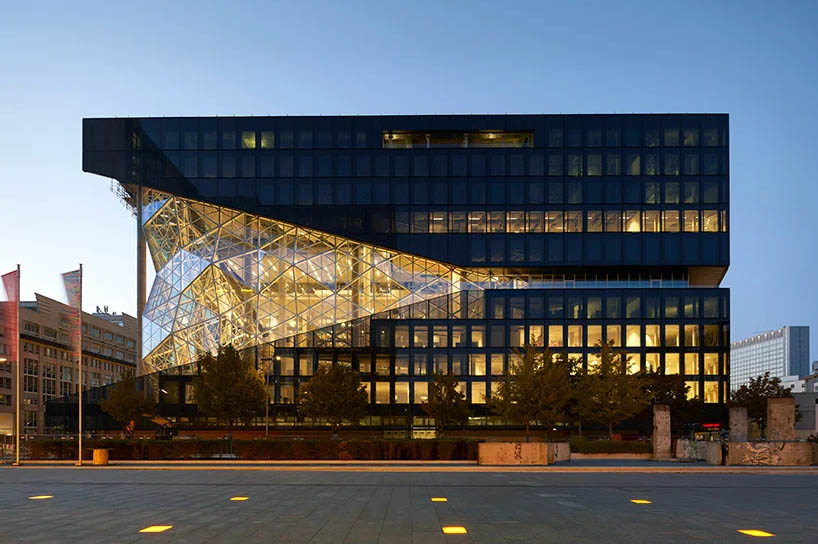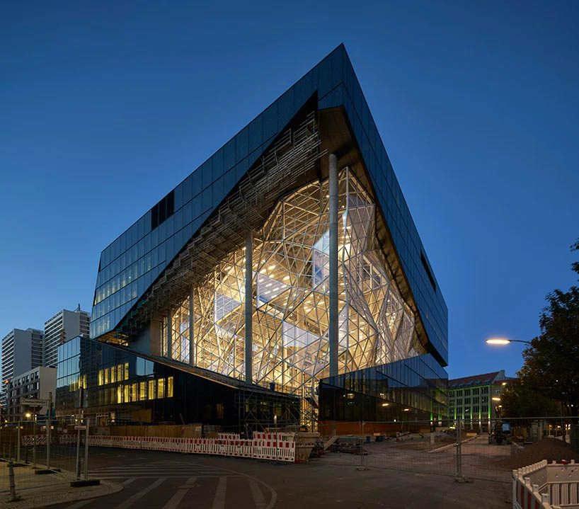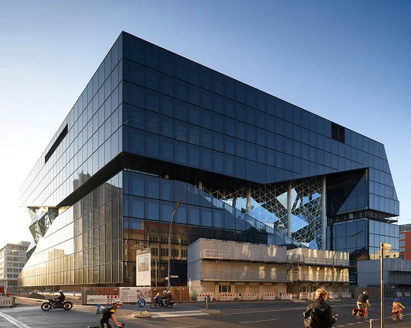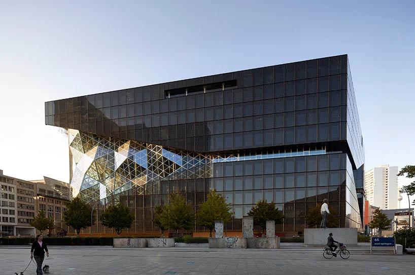 once open, the public will also be able to experience the building on three different levels: the ground floor lobby, which contains studios, event, and exhibition spaces; the meeting bridge, a viewing platform where visitors can witness the daily functioning of the company; and a roof-top bar. the project — which signifies axel springer’s move from print to digital media — has special significance to OMA founder rem koolhaas, who was a journalist before beginning his architectural studies