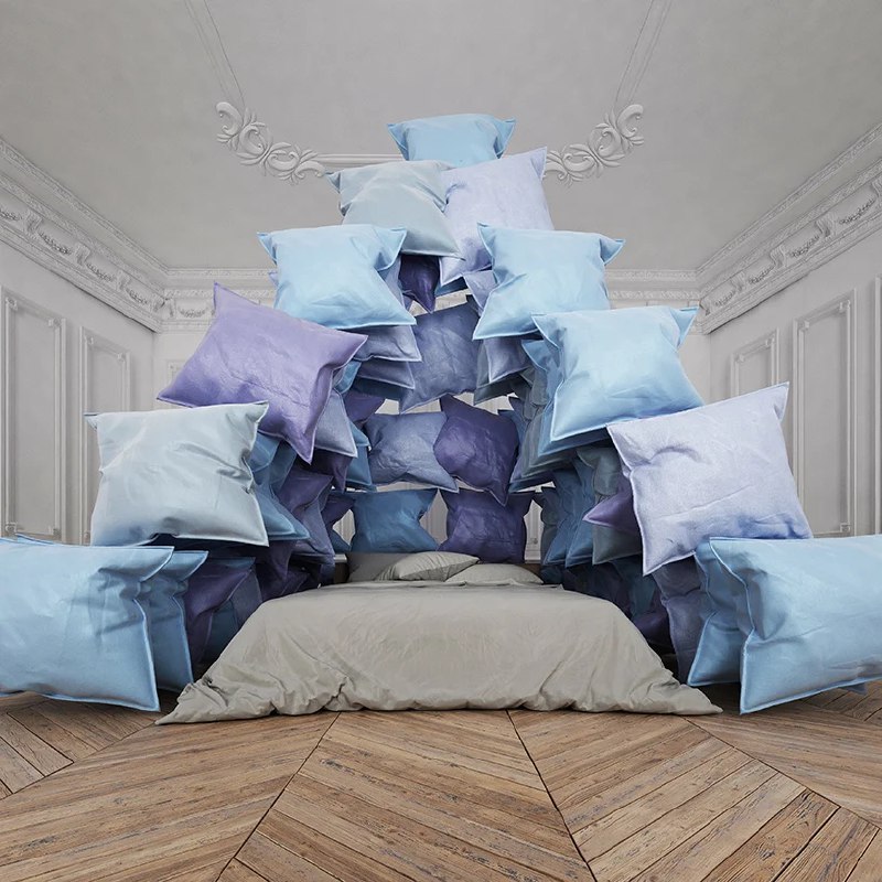 in these difficult times, we need reassuring images. often from an early age, children build mini huts and dens with cushions, pillows and blankets. the pyramid of pillows is a tribute to these constructions.