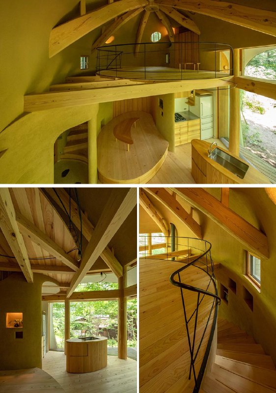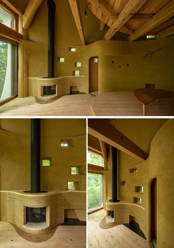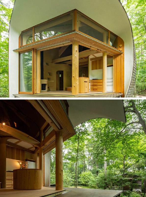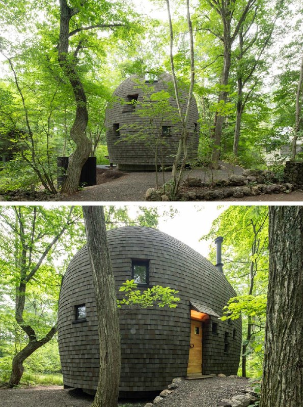 The small house was built using materials like local wood and clay, and crafted using traditional building techniques. Dark wood shingles cover the curved exterior, while recessed windows and skylights capture small amounts of natural light, and a light wood door welcomes guests.