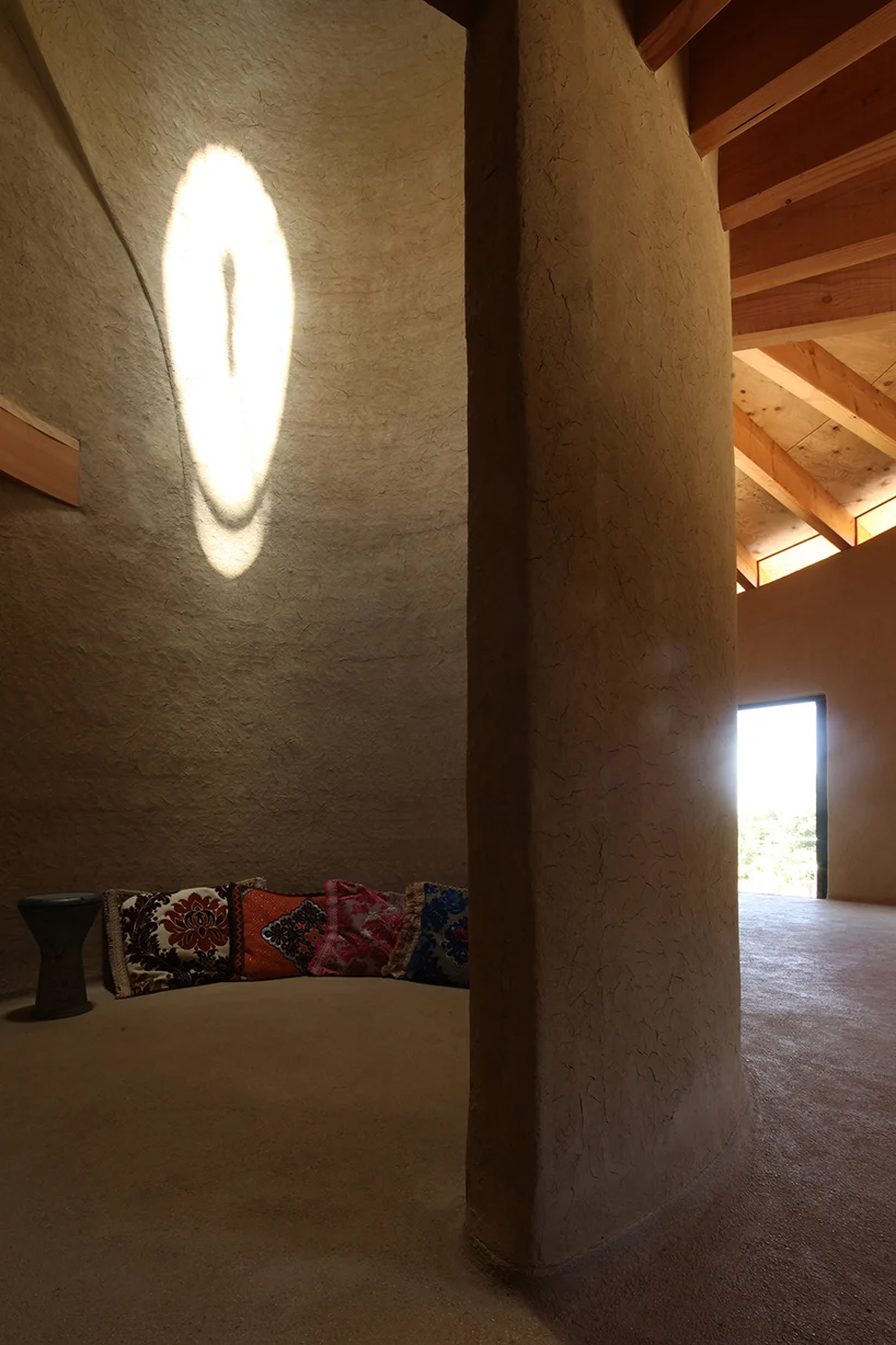 to support the roof, timber beams follow the spiral and ‘radiate’ from the central space, exposed in the interior. every part of the timber construction was hand-carved by carpenters. the interior wall was finished with awaji island’s earth on top of interwoven lattice of bamboo collected around the site. the outer wall was scraped with a finishing of soil and mortar, while the floor was finished with tataki technique, allowing the interior to store heat and control humidity.