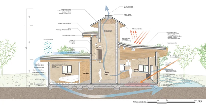 the roof is planned as a spiral garden, with the ground rises towards the sky. the spiral roof offers varying sunlight exposure, height and humidity, hence able to support plants with diverse growth requirements. when it rains, the roof garden is soaked while rainwater flows towards the pond. in the summer, incoming wind will be cooled by the pond before it enters the house. by introducing natural phenomena as inseparable parts of the house, the family will be one with nature, living in a house where the earth and trees grow.