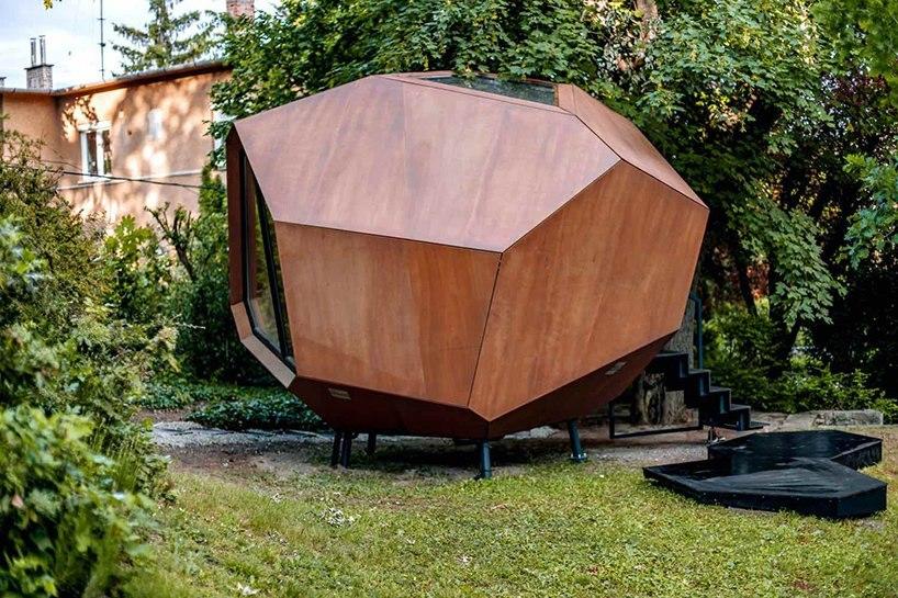 in the design of the compact workstation cabin, hello wood begins by imagining a highly functional space in which every square inch of the interior is designed. workstation cabin presents a playful hybrid of design and architecture. transcending the conventional geometry of the cube, the work is expressed more as an art piece that emerges from the landscape. within the faceted volume, recalling a rocky landform, nature feels truly close. the interior is dominated by a finish of natural pine wood while massive windows invite the world of the garden inside.