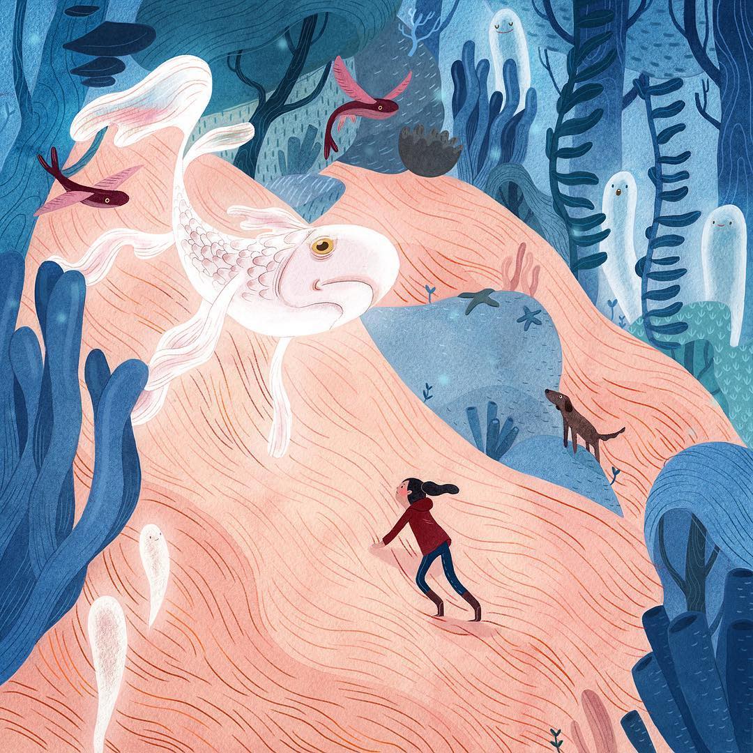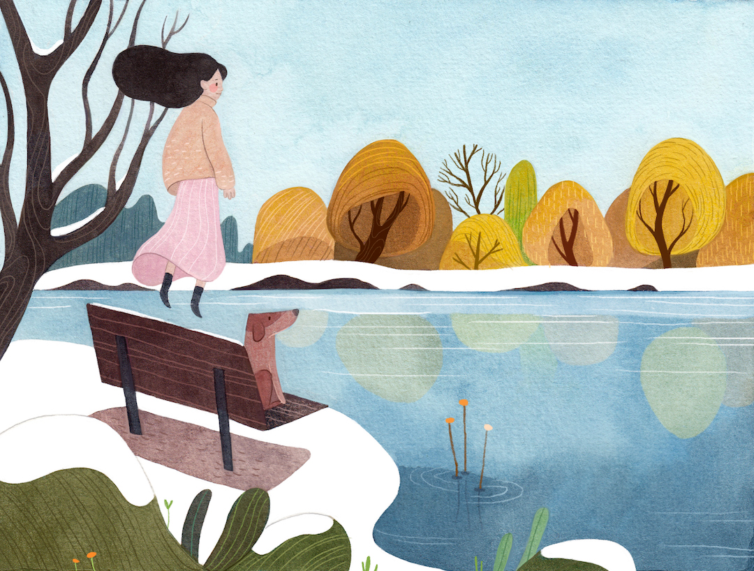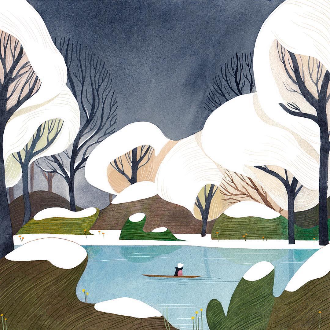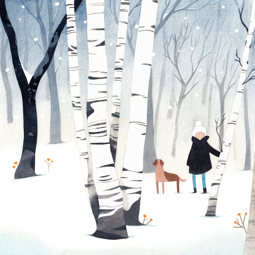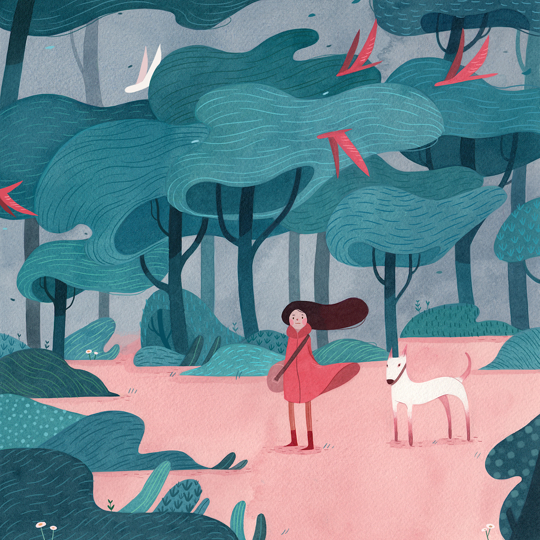 Brwnpaperbag_Have you ever been hiking in a forest? When you’re alone and surrounded by tall trees, it makes you feel like you’re in a fairy tale. Illustrator Vivian Mineker captures this feeling in her watercolor and colored pencil pieces. Featuring towering timber and even some spookiness, her characters set off for adventure—often with an animal pal in tow.