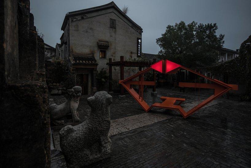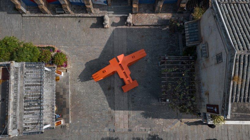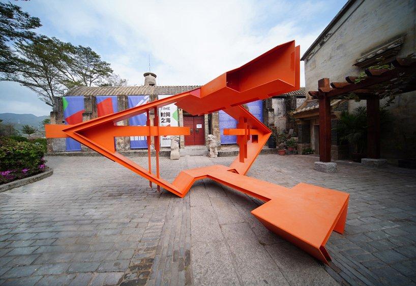 Designboom_as part of shenzhen‘s bi-city biennale of urbanism and architecture, studio frank havermans has designed a new architectural installation for a plot in dapeng fortress. the structure, titled ‘KAPKAR / DPF-4B’ is site specific and draws on the surrounding vernacular architecture to create a reinterpretation of local building elements. the result is a futuristic and bright orange meeting point for the community that intends to ‘work like a magnet.’